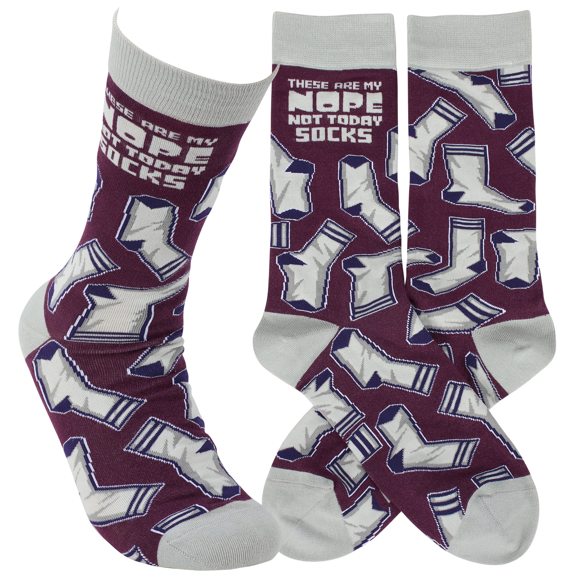 A pair of colorful socks from our LOL-Made You Smile Collection displaying a playful hand illustrated design of messy socks with a sassy sentiment that reads "These Are My Nope Not Today Socks." These giftable socks are made with a cotton, nylon, and spandex blend for a one size fits most design. Our My Nope Not Today socks come with a decorative header card and a clear plastic hanger for easy rack display and gifting. A funny gift perfect for everyday self-expression.