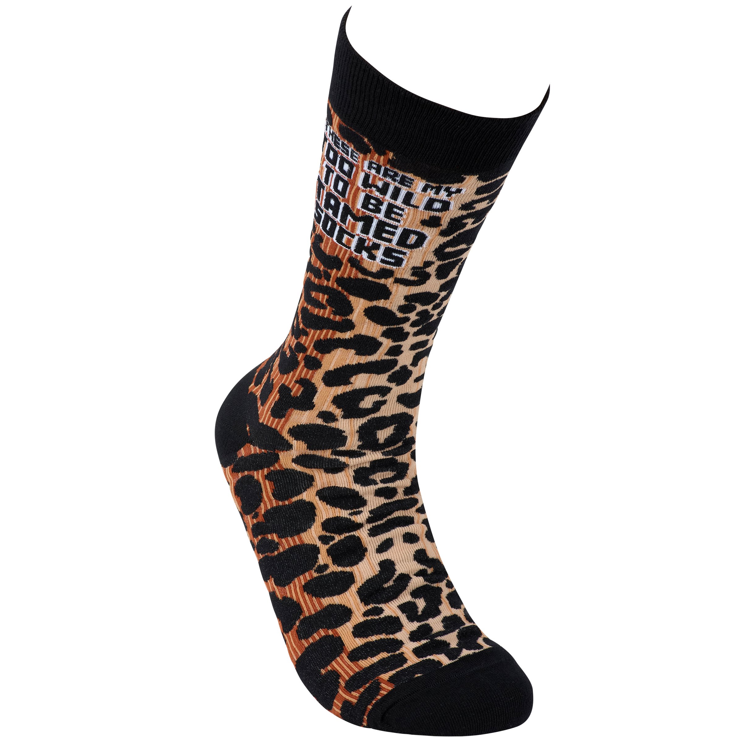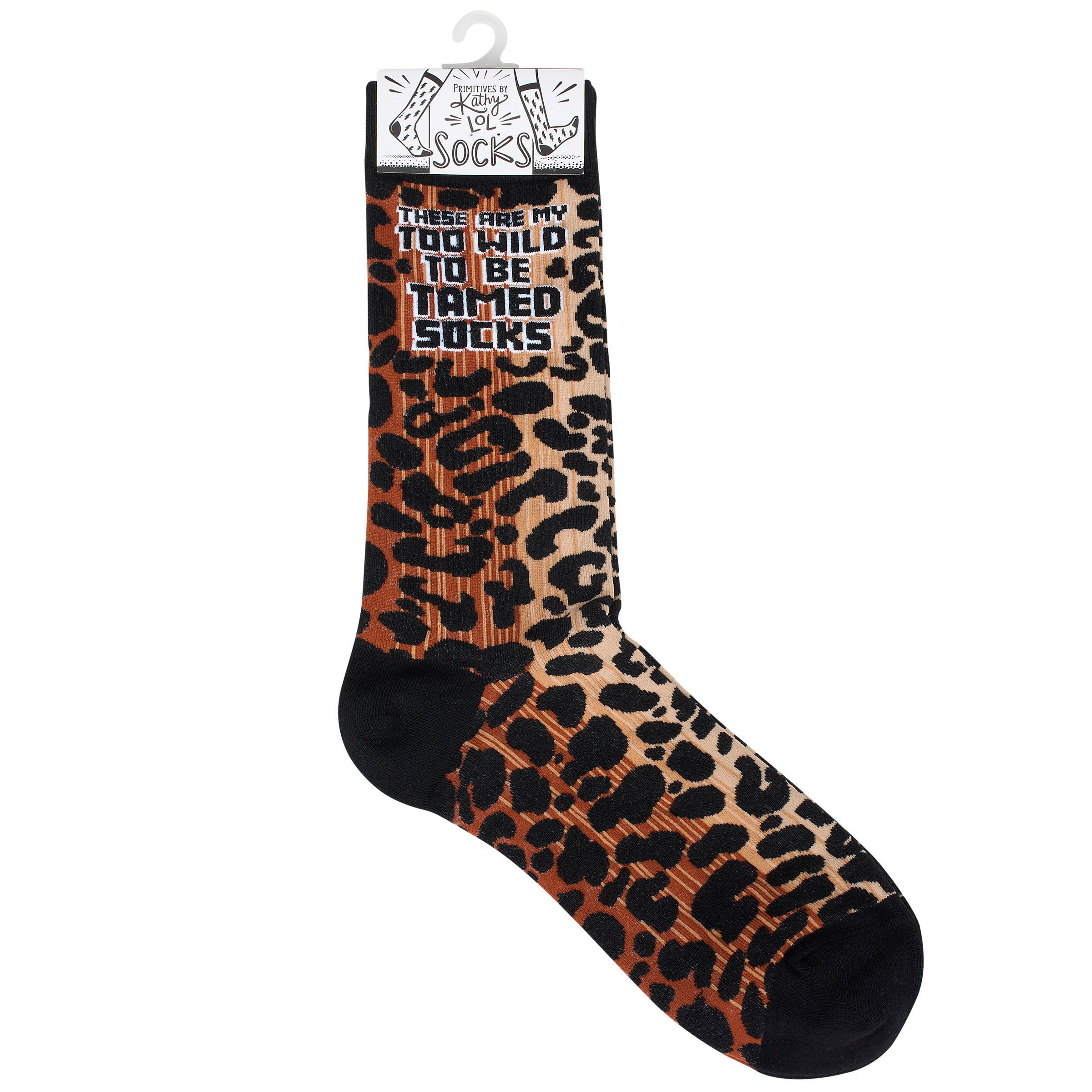 A pair of colorful socks from our LOL-Made You Smile Collection displaying a playful hand illustrated design of cheetah spots with a sassy sentiment that reads "These Are My Too Wild To Be Tamed Socks." These giftable socks are made with a cotton, nylon, and spandex blend for a one size fits most design. Our My Too Wild To Be Tamed socks come with a decorative header card and a clear plastic hanger for easy rack display and gifting. A funny gift perfect for everyday self-expression.