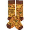 A pair of colorful woven socks from our Father's Day Collection displaying a hand illustrated design of nachos with a fun dad-themed sentiment that reads "Nacho Average Dad." Socks feature a one size fits most design made with cotton, nylon, and spandex. Our Nacho Average Dad socks come with a header card and a clear plastic hanger for display. A fun Father's Day gift and accessory perfect for everyday self-expression.