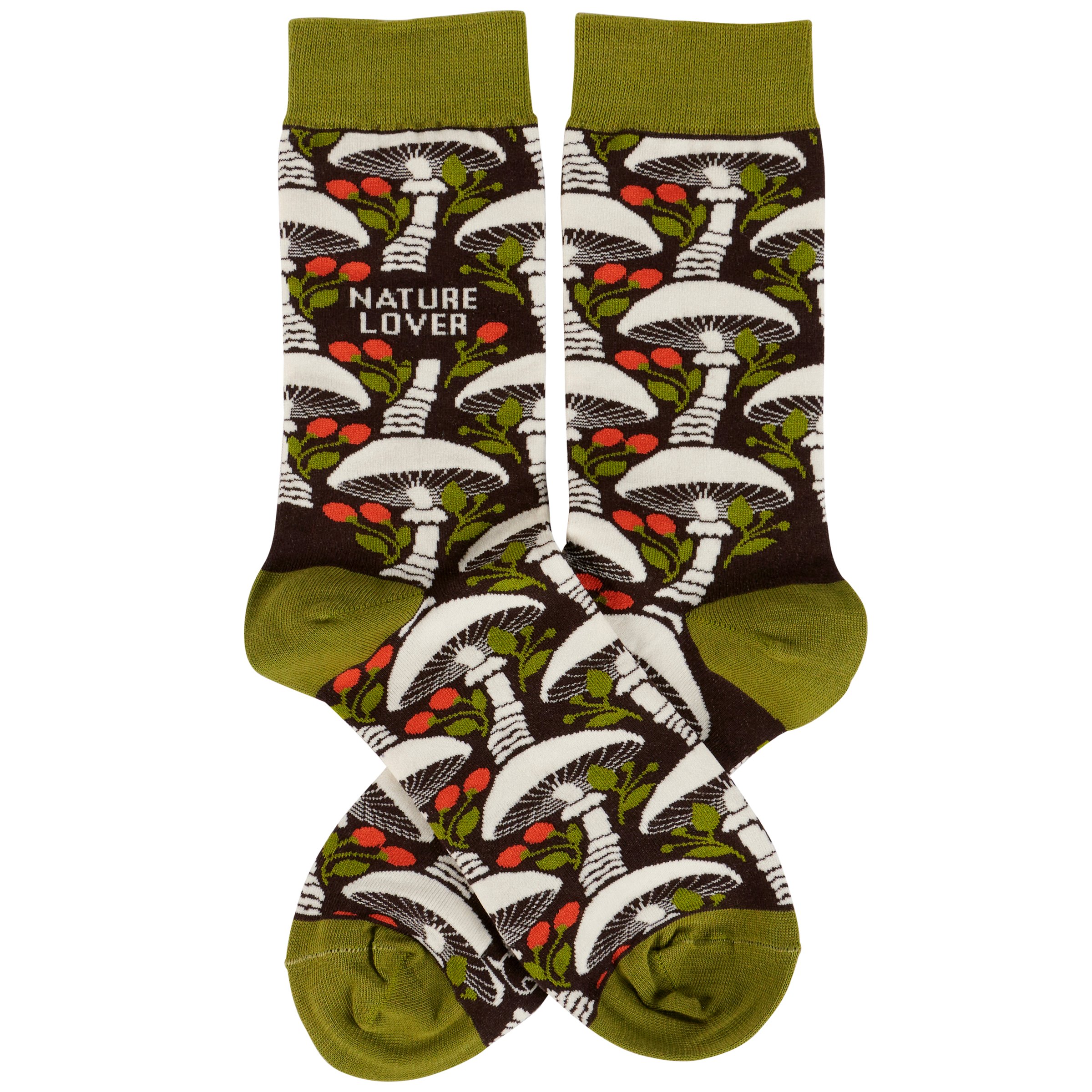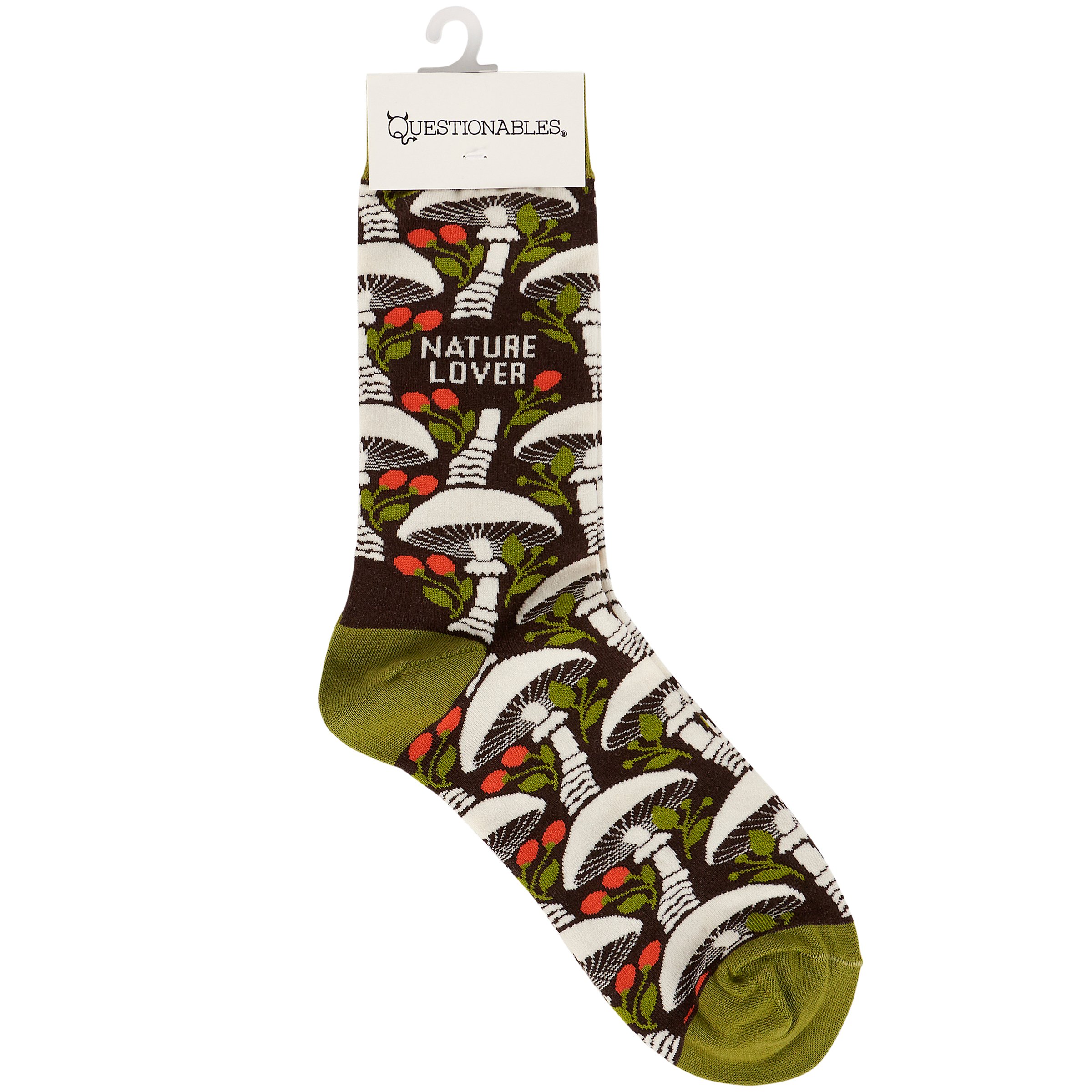 Give anyone that steps into personal space a vibe check with this pair of colorful socks displaying a relaxing mushroom pattern with an earthy sentiment that reads "Nature Lover." Questionables socks are made with cotton, nylon, and spandex to create a one-size-fits-most design. Packaged on a clear plastic hanger with header card for graceful display in store. Our Nature Lover socks are perfect for maximizing chill at home or gifting to pass that feeling to someone who needs it. Colorful and cozy socks always make a great gift that offer many ways to express themselves every day.
