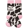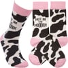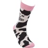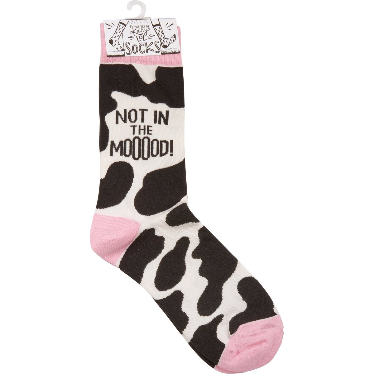 A pair of colorful woven socks from our LOL Made You Smile Collection displaying a hand illustrated design of cow print and pink accents with "Not In The Mooood!" sentiment. Socks feature a one size fits most design made with cotton, nylon, and spandex. Our Not In The Mooood socks come with a header card and a clear plastic hanger for display. A fun everyday accessory perfect for self-expression or gifting on any occasion.
