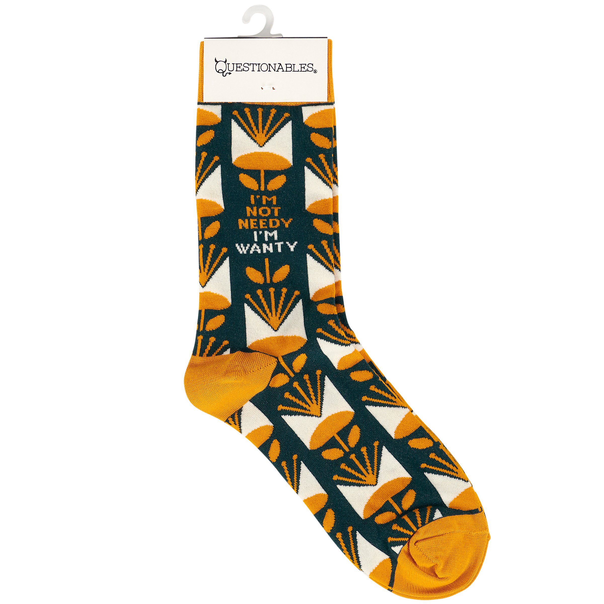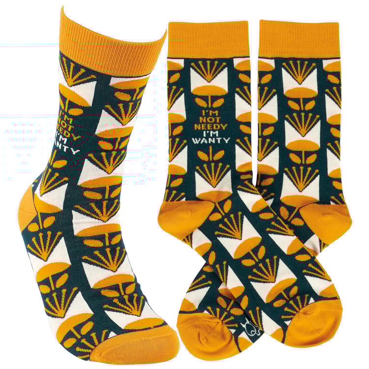 When people aren't getting your vibe, tell them to see it from your perspective, but make sure to do it in style! This pair of colorful socks flaunts a vibrant floral pattern with a sassy sentiment that reads "I'm Not Needy - I'm Wanty." Questionables socks are made with cotton, nylon, and spandex to create a one-size-fits-most design. Packaged on a clear plastic hanger with header card for graceful display in store. Our Not Needy socks are perfect for standing out and making a statement while getting a giggle out of others. Colorful and cozy socks always make a great gift that offer many ways to express themselves every day.