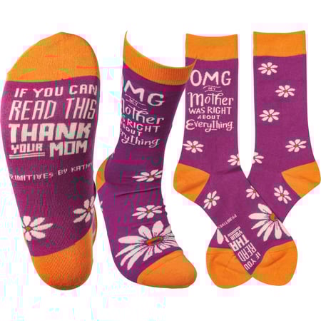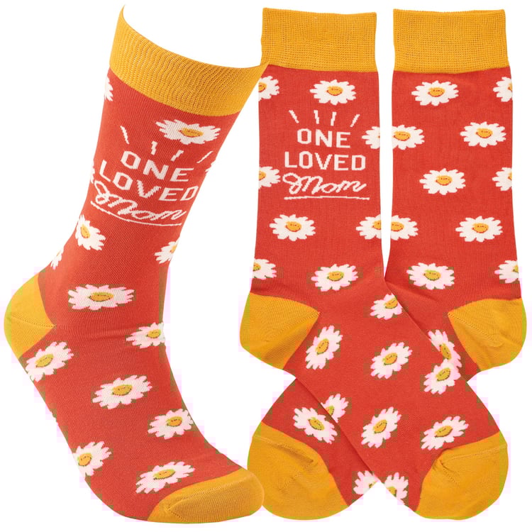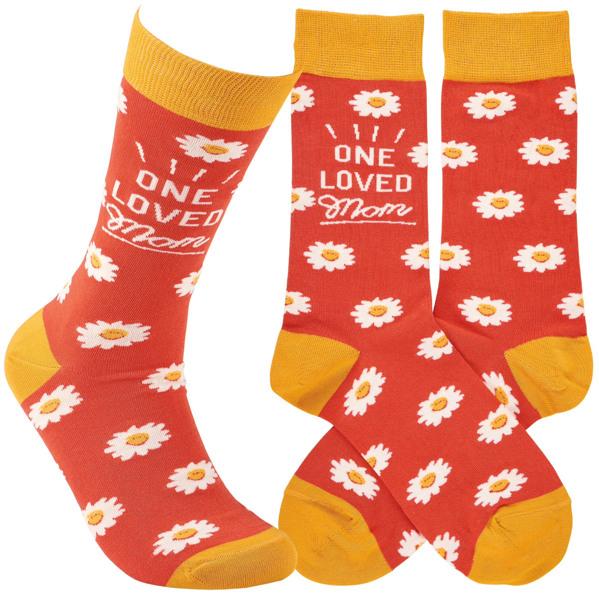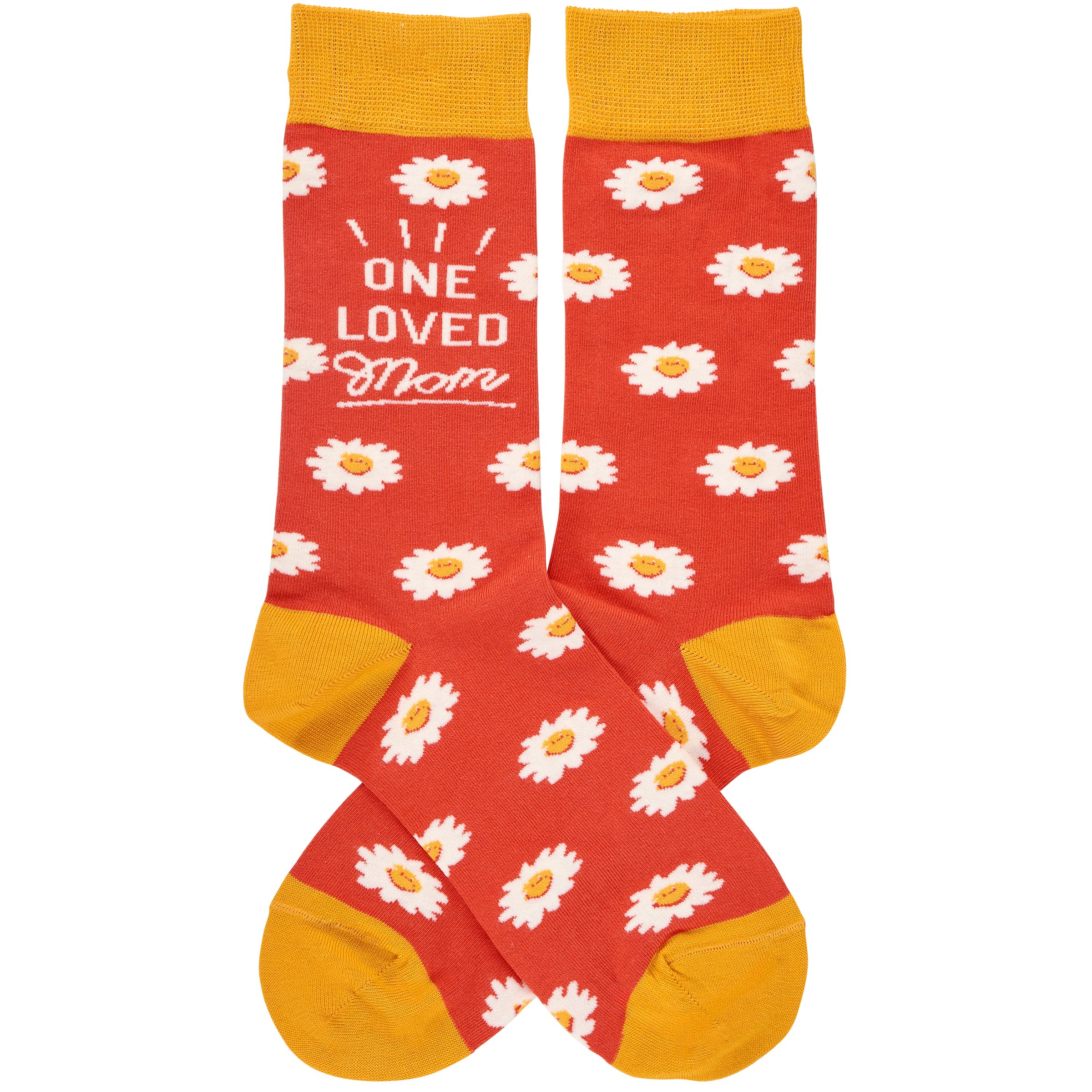 A pair of colorful woven socks from our Mother's Day Collection displaying unique hand illustrated designs of daisies with a fun mom-themed sentiment that reads "One Loved Mom." Socks feature a one size fits most design made with cotton, nylon, and spandex. Our One Loved Mom socks come with a header card and a clear plastic hanger for display. A fun Mother's Day gift and accessory perfect for everyday self-expression.
