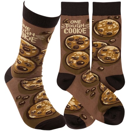 A pair of colorful socks from our LOL-Made You Smile Collection displaying playful hand illustrated designs of chocolate chip cookies with a sassy sentiment that reads "One Tough Cookie." These giftable socks are made with a cotton, nylon, and spandex blend for a one size fits most design. Our One Tough Cookie socks come with a decorative header card and a clear plastic hanger for easy rack display and gifting. A funny gift perfect for everyday self-expression.