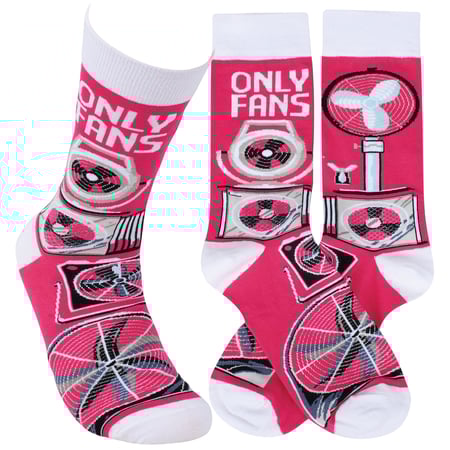 A pair of colorful socks from our LOL-Made You Smile Collection displaying playful hand illustrated designs of various house fans with a funny sentiment that reads "Only Fans." These giftable socks are made with a cotton, nylon, and spandex blend for a one size fits most design. Our Only Fans socks come with a decorative header card and a clear plastic hanger for easy rack display and gifting. A funny gift perfect for everyday self-expression.