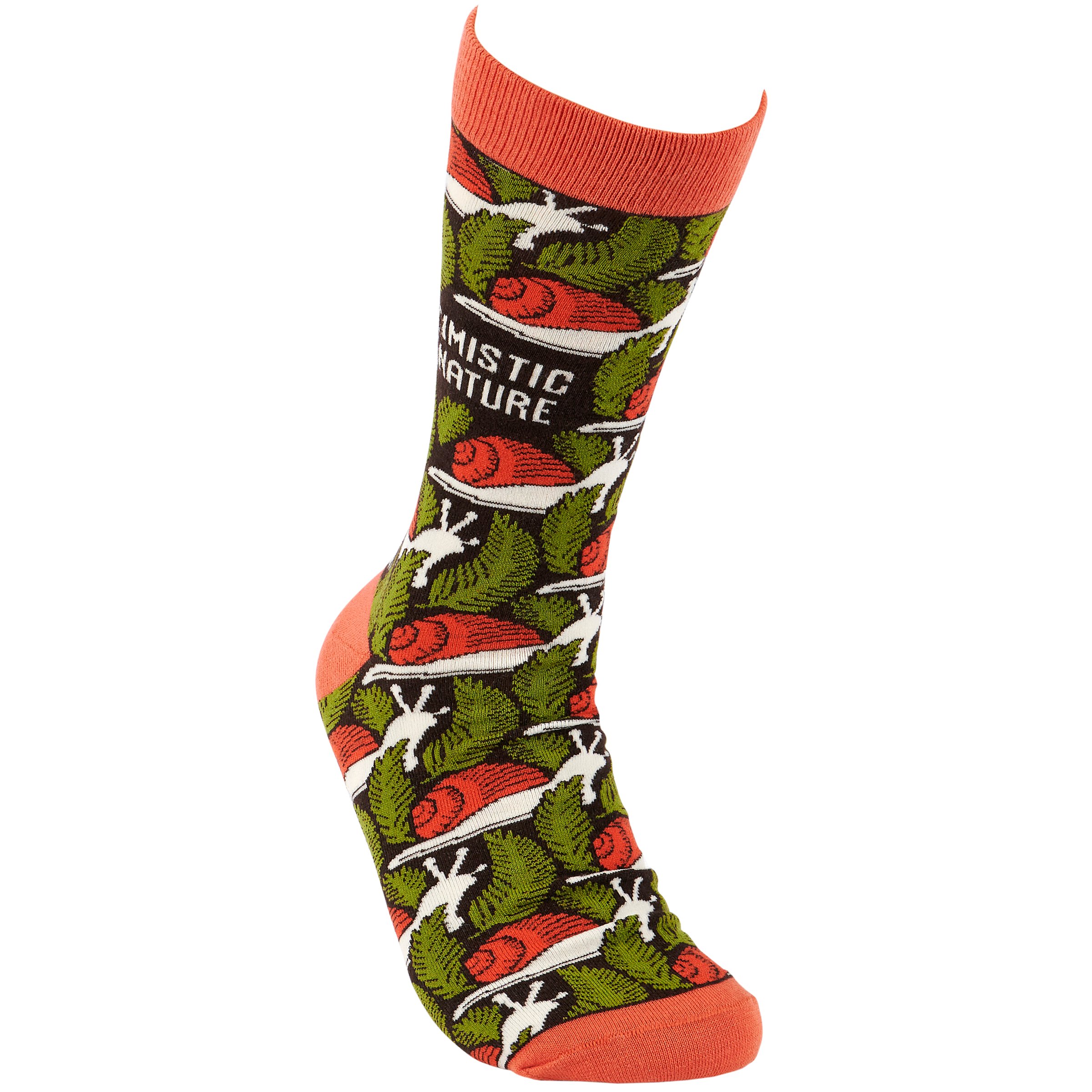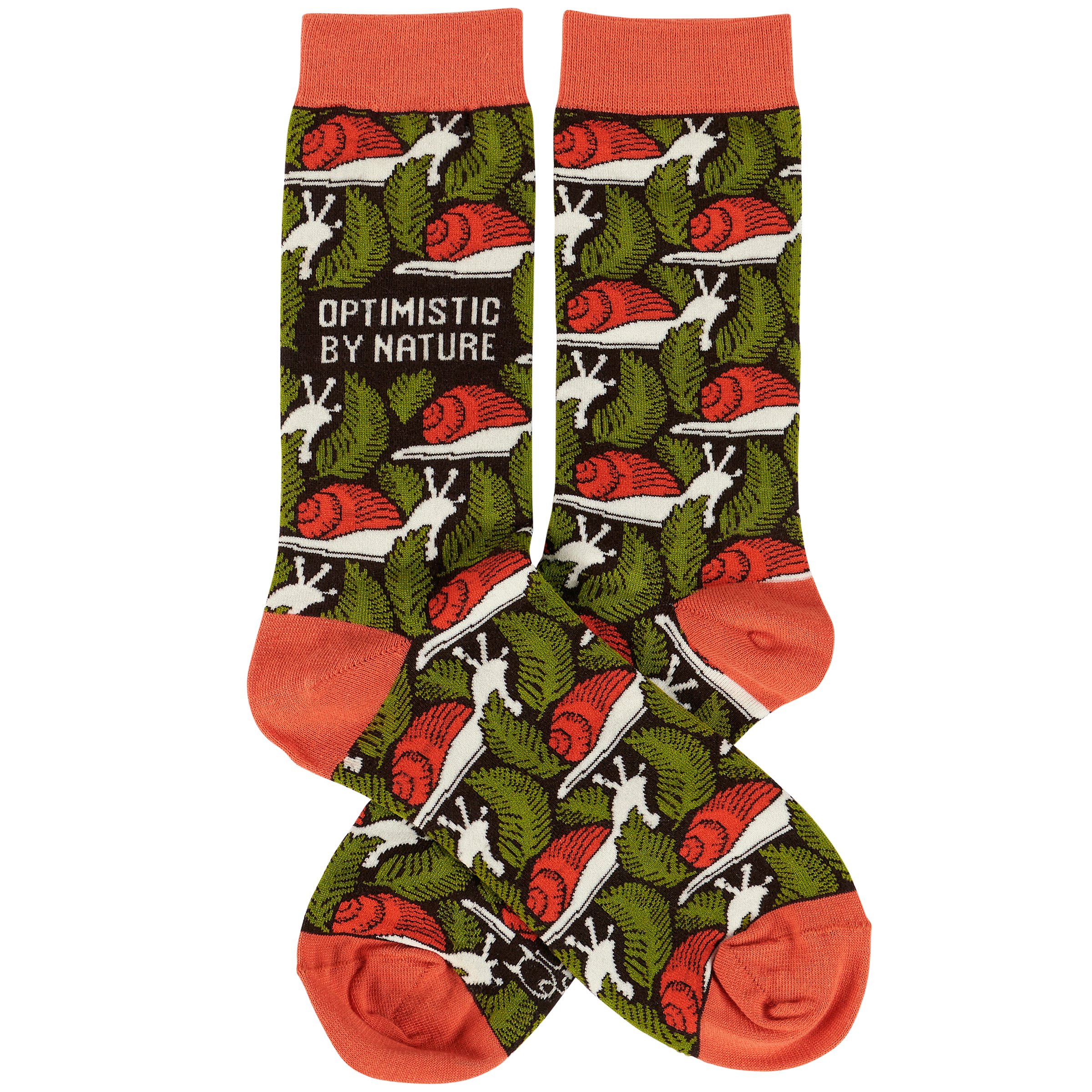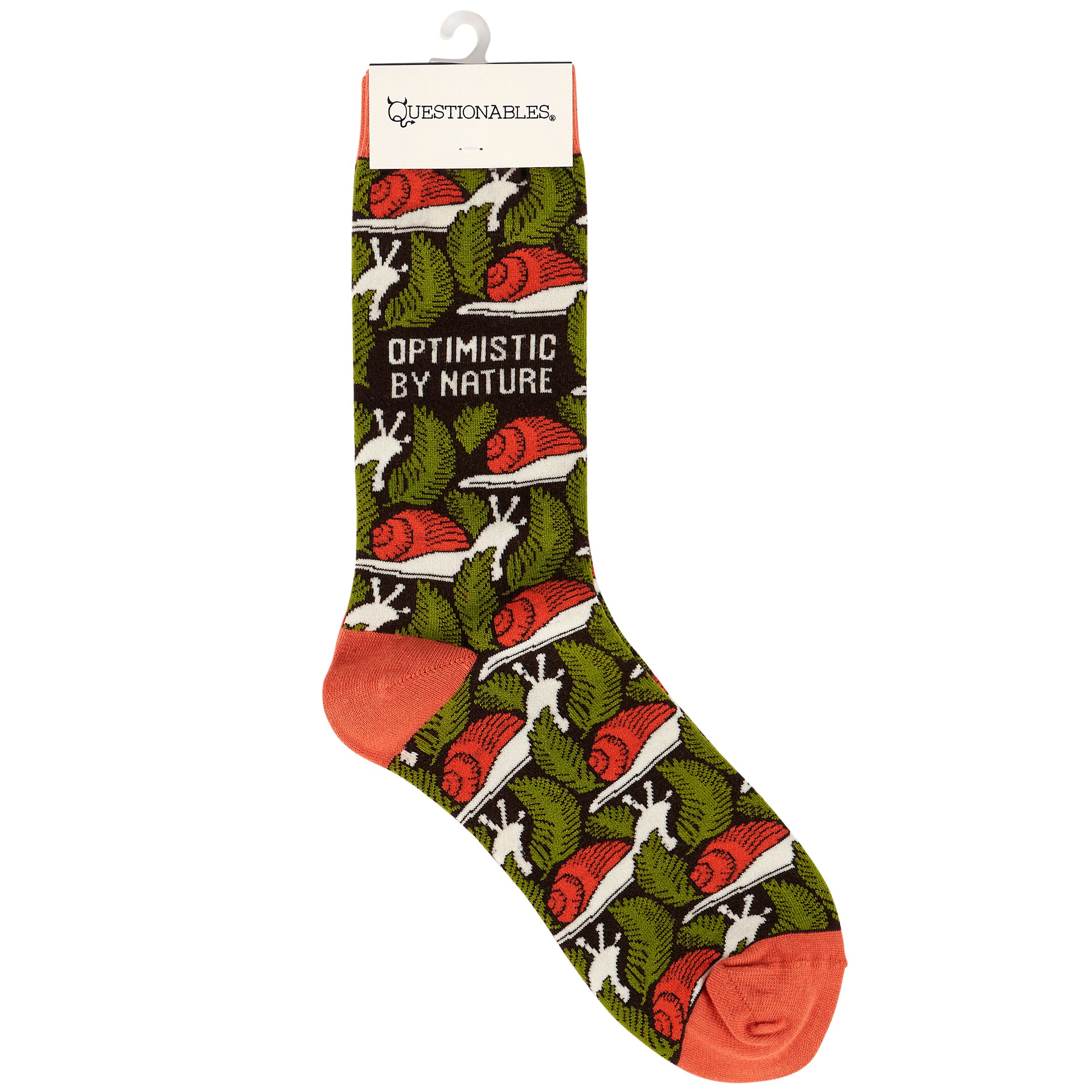 Give anyone that steps into personal space a vibe check with this pair of colorful socks displaying a relaxing snail pattern with an honest sentiment that reads "Optimistic By Nature." Questionables socks are made with cotton, nylon, and spandex to create a one-size-fits-most design. Packaged on a clear plastic hanger with header card for graceful display in store. Our Optimistic socks are perfect for maximizing chill at home or gifting to pass that feeling to someone who needs it. Colorful and cozy socks always make a great gift that offer many ways to express themselves every day.