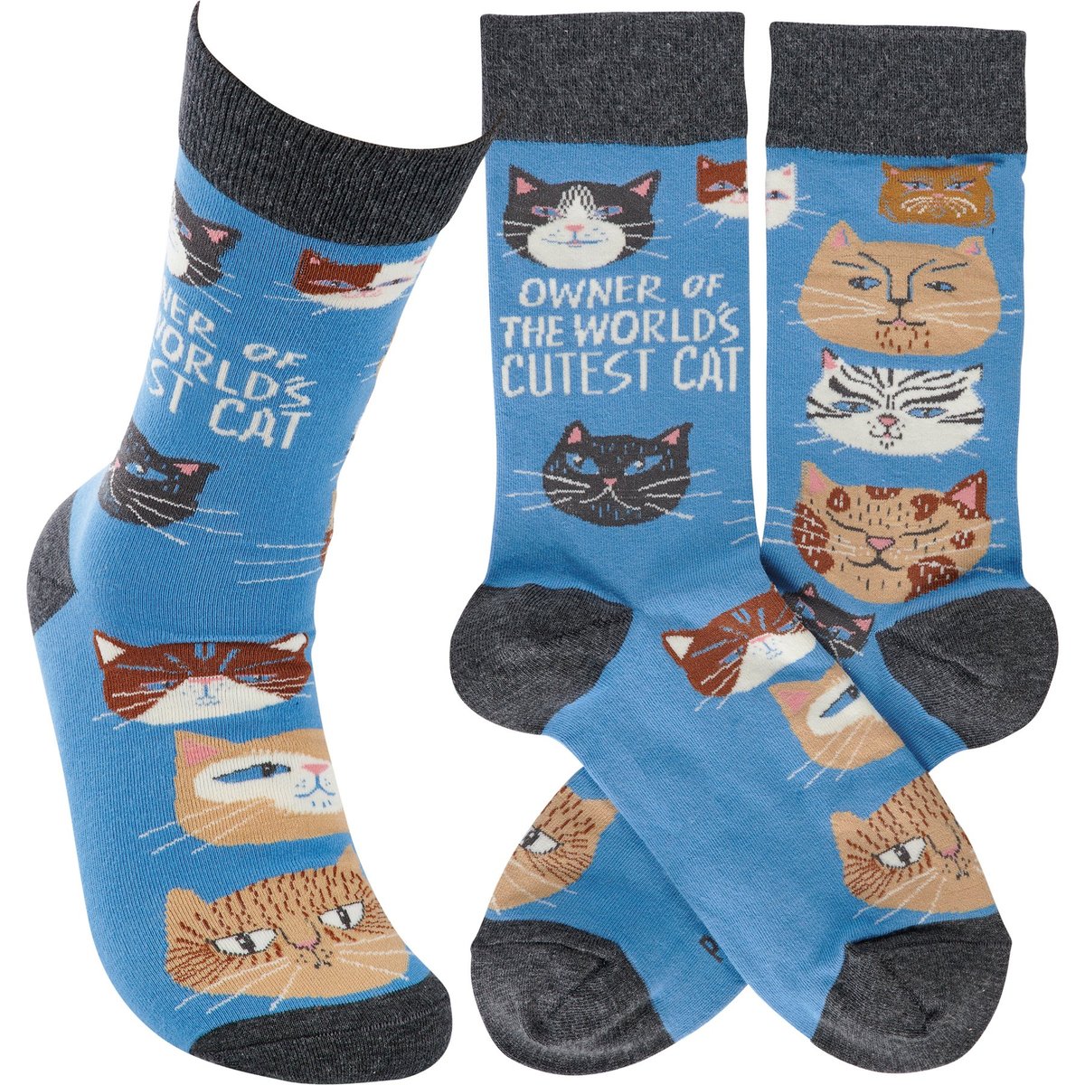A pair of colorful woven socks from our Pet Collection displaying hand illustrated designs of various cats with "Owner Of The World's Cutest Cat" sentiment. Socks feature a one size fits most design made with cotton, nylon, and spandex. Our Owner Of World's Cutest Cat socks come with a header card and a clear plastic hanger for display. A fun everyday accessory perfect for self-expression or gifting on any occasion.