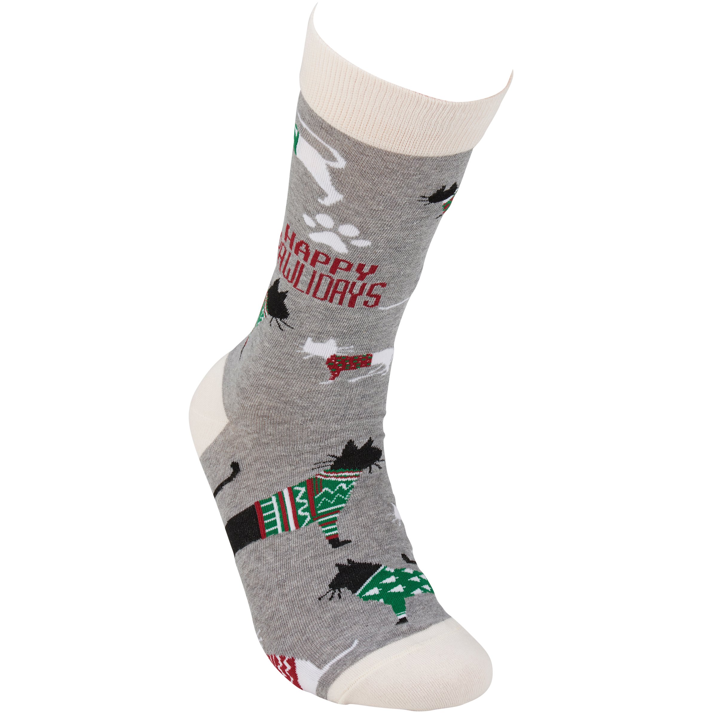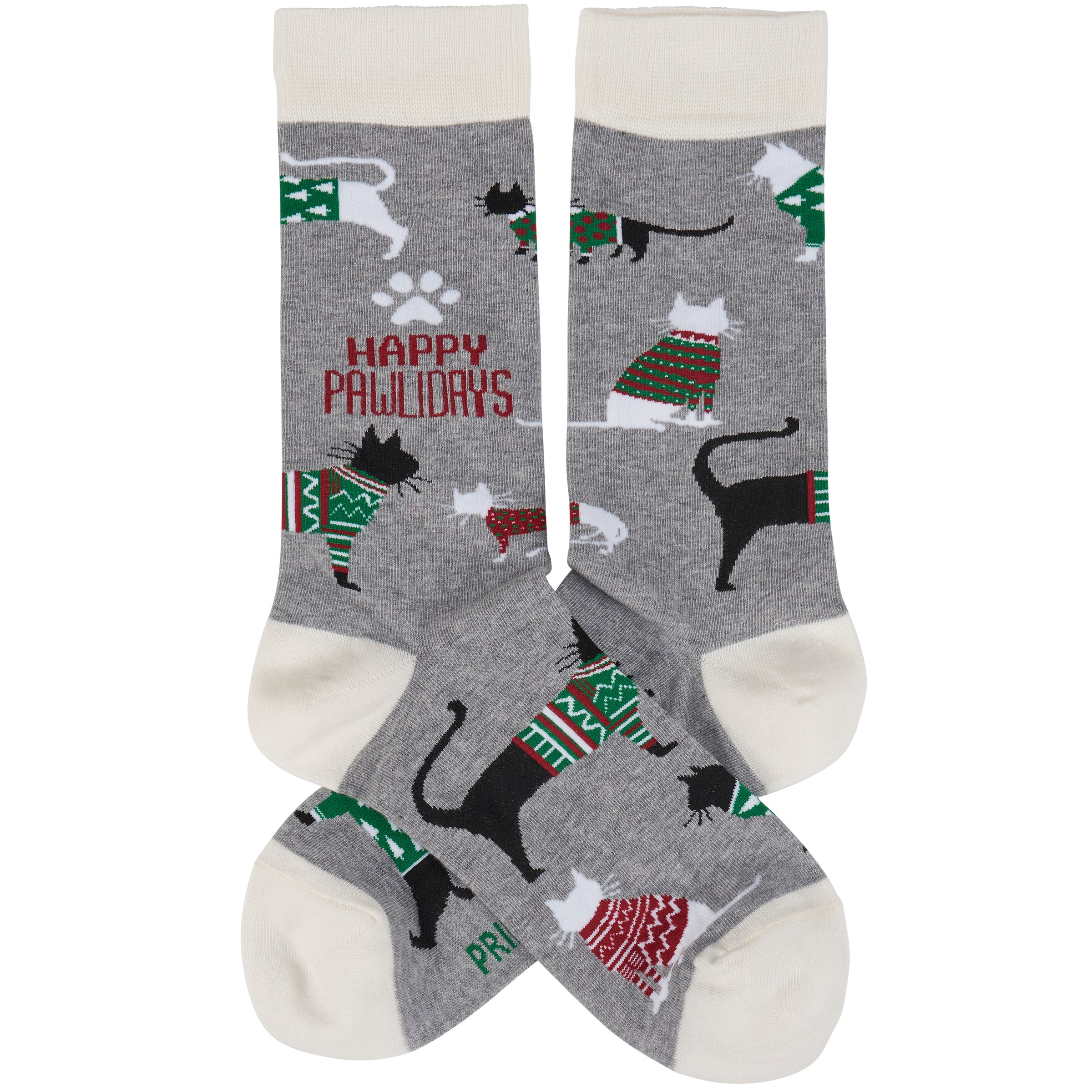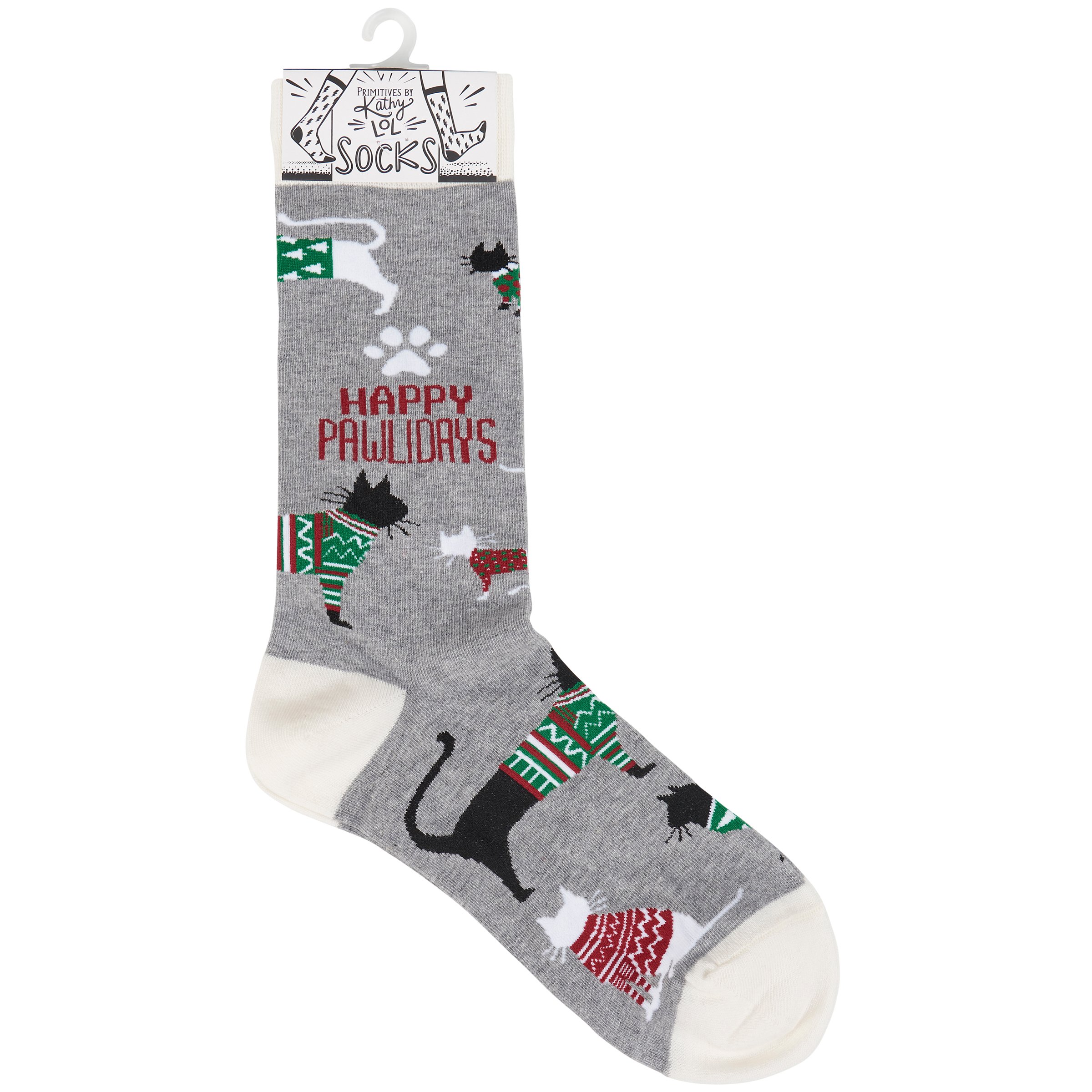 A pair of colorful socks from our Holiday Pet Collection displaying unique hand illustrated designs of cats in Christmas sweaters with a fun seasonal sentiment that reads "Happy Pawlidays." Seasonal socks feature a one size fits most design made with cotton, nylon, and spandex. Our Pawlidays Cat socks come with a header card and a clear plastic hanger for display. A fun pet-themed gift perfect for seasonal self-expression.