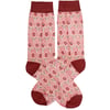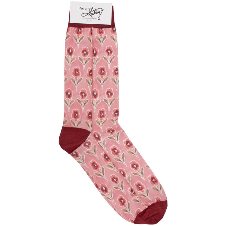 A pair of colorful socks displaying a red floral pattern recreated from an original hand painted design that pairs well with gifts from ourĀ Mother's Day Collection. Socks feature a one size fits most design made with cotton, nylon, and spandex. Our Pink Floral socks come with a header card and a clear plastic hanger for easy display. A lovely Mother's Day gift and accessory perfect for everyday self-expression.