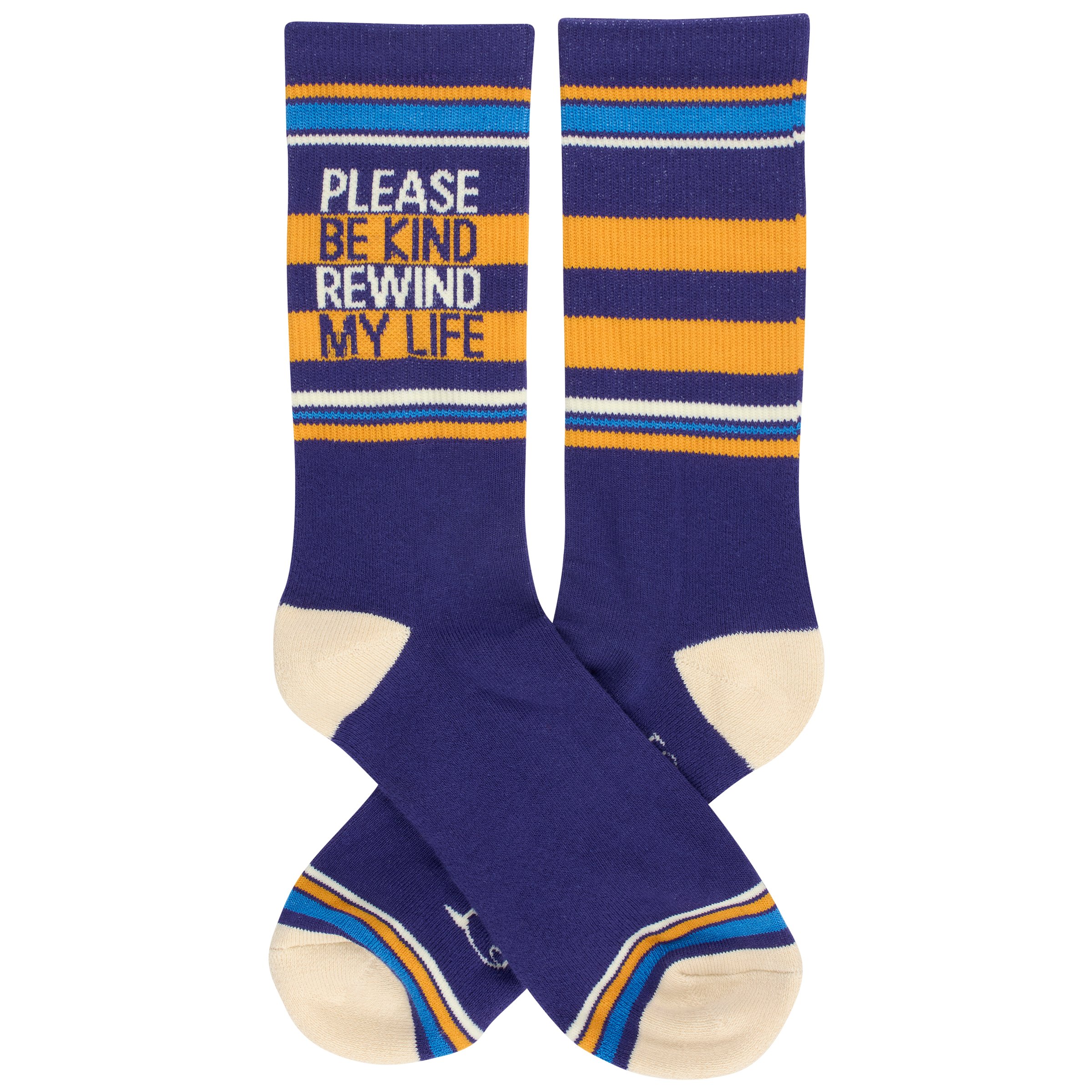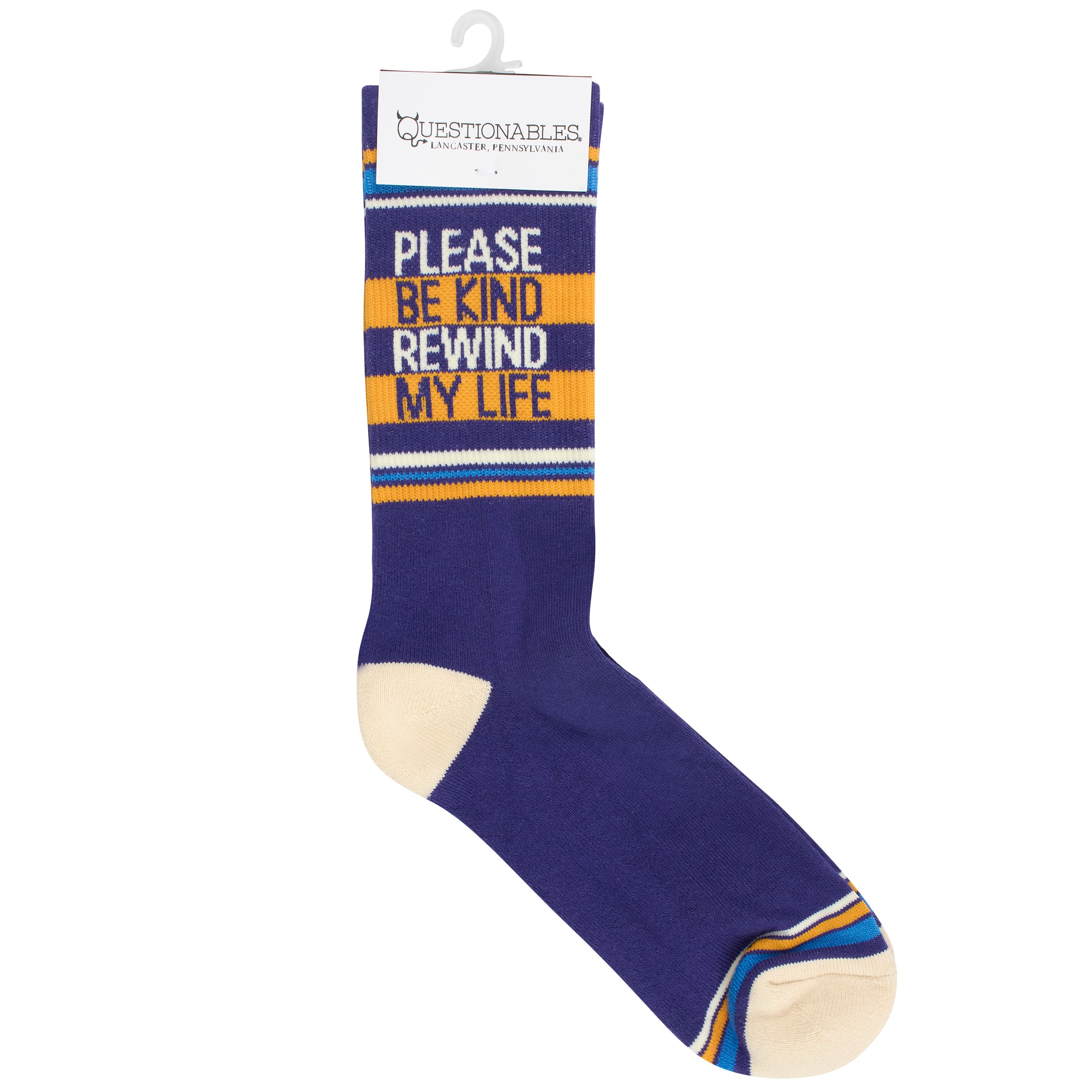 Our mid-calf varsity inspired socks are knitted with ribbed and striped designs for a comfy athleisure style and then finished with a questionable phrase. This fun pair of expressive socks displays a funny relatable sentiment that reads "Please Be Kind Rewind My Life" for those who wish life was like a movie. Questionables socks are made with cotton, nylon, and spandex to create a one-size-fits-most design. Each pair of socks is packaged on a clear plastic hanger with header card for graceful display in store. Our Be Kind Rewind My Life socks call back to a retro style but with modern mentality, perfect for making a statement while getting a giggle out of others. Colorful and cozy socks always make a great gift for everyday self-expression.