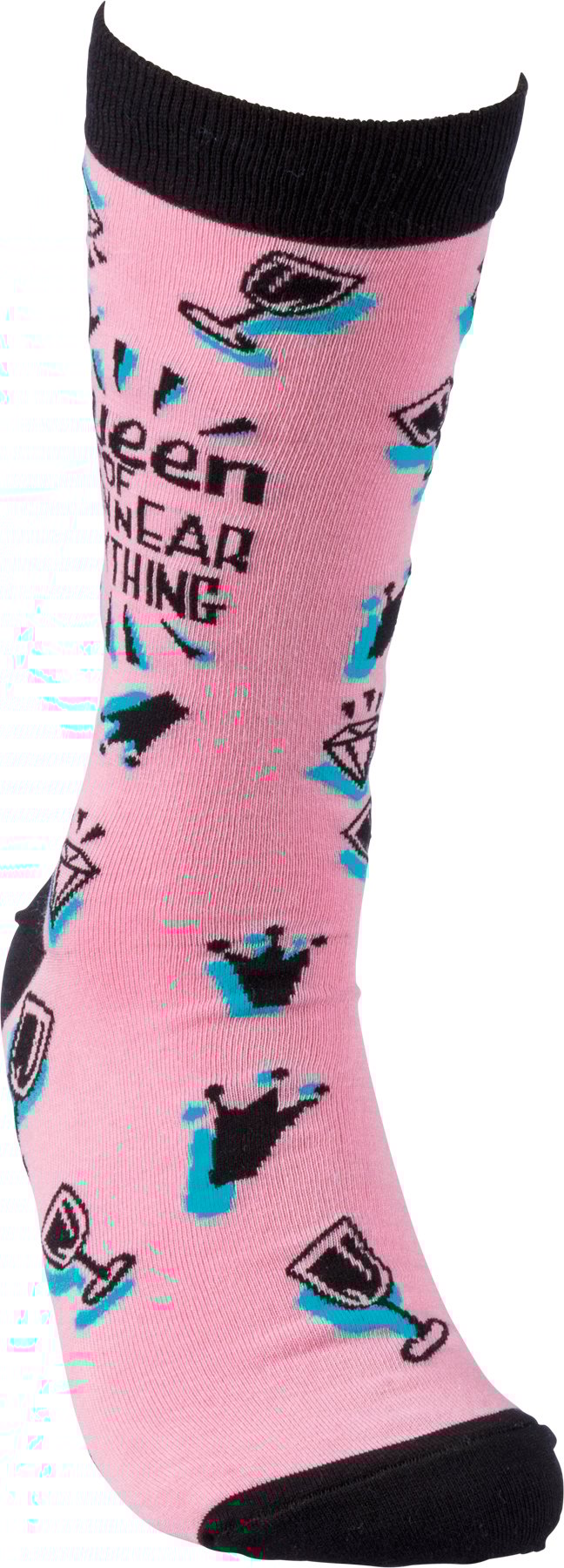 These colorful socks feature woven designs with coordinating "Queen Of Damn Near Everything" sentiment. Cotton, nylon, spandex. One size fits most.