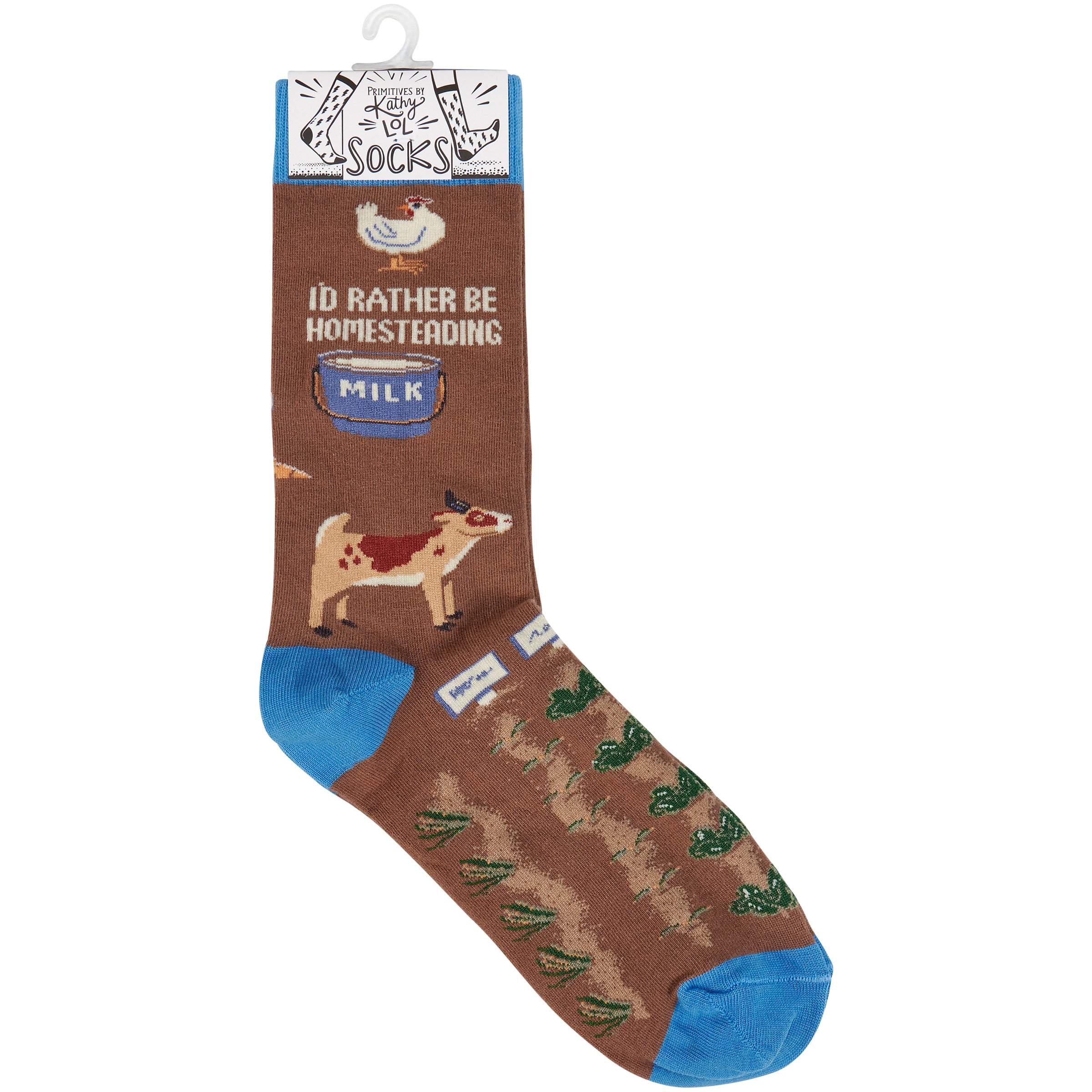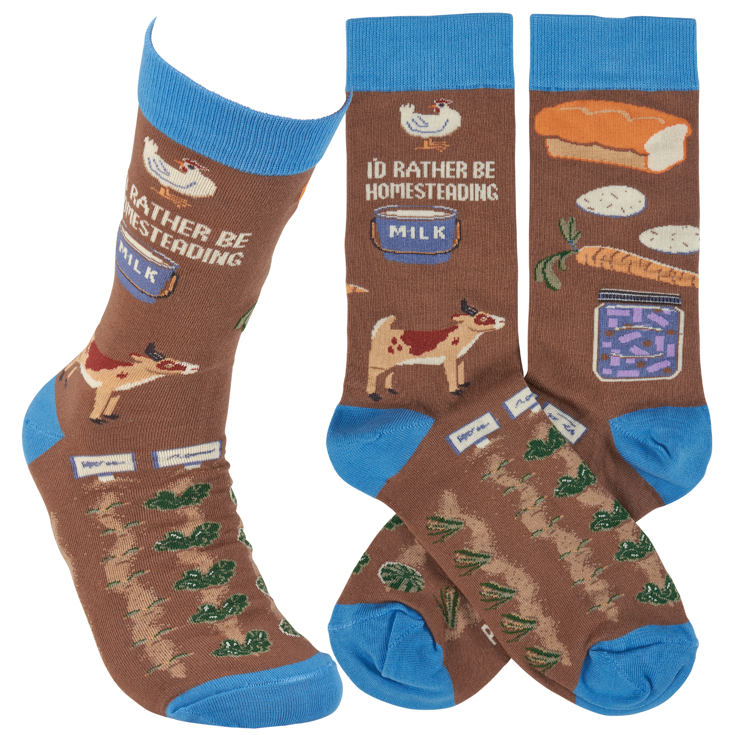 A pair of colorful socks from our Homestead Collection displaying unique hand illustrated designs of various farming motifs with a fun sentiment that reads "I'd Rather Be Homesteading." Socks feature a one size fits most design made with cotton, nylon, and spandex. Our Rather Be Homesteading socks come with a header card and a clear plastic hanger for display. A fun farm-themed gift perfect for everyday self-expression.