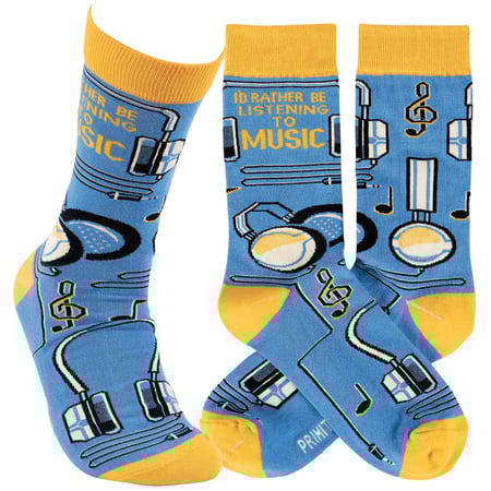 A pair of colorful socks from our LOL-Made You Smile Collection displaying playful hand illustrated designs of headphones and music notes with a fun music inspired sentiment that reads "I'd Rather Be Listening To Music." These giftable socks are made with a cotton, nylon, and spandex blend for a one size fits most design. Our Rather Be Listening To Music socks come with a decorative header card and a clear plastic hanger for easy rack display and gifting. A fun music-themed gift perfect for everyday self-expression.