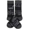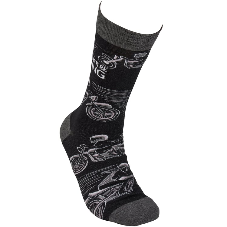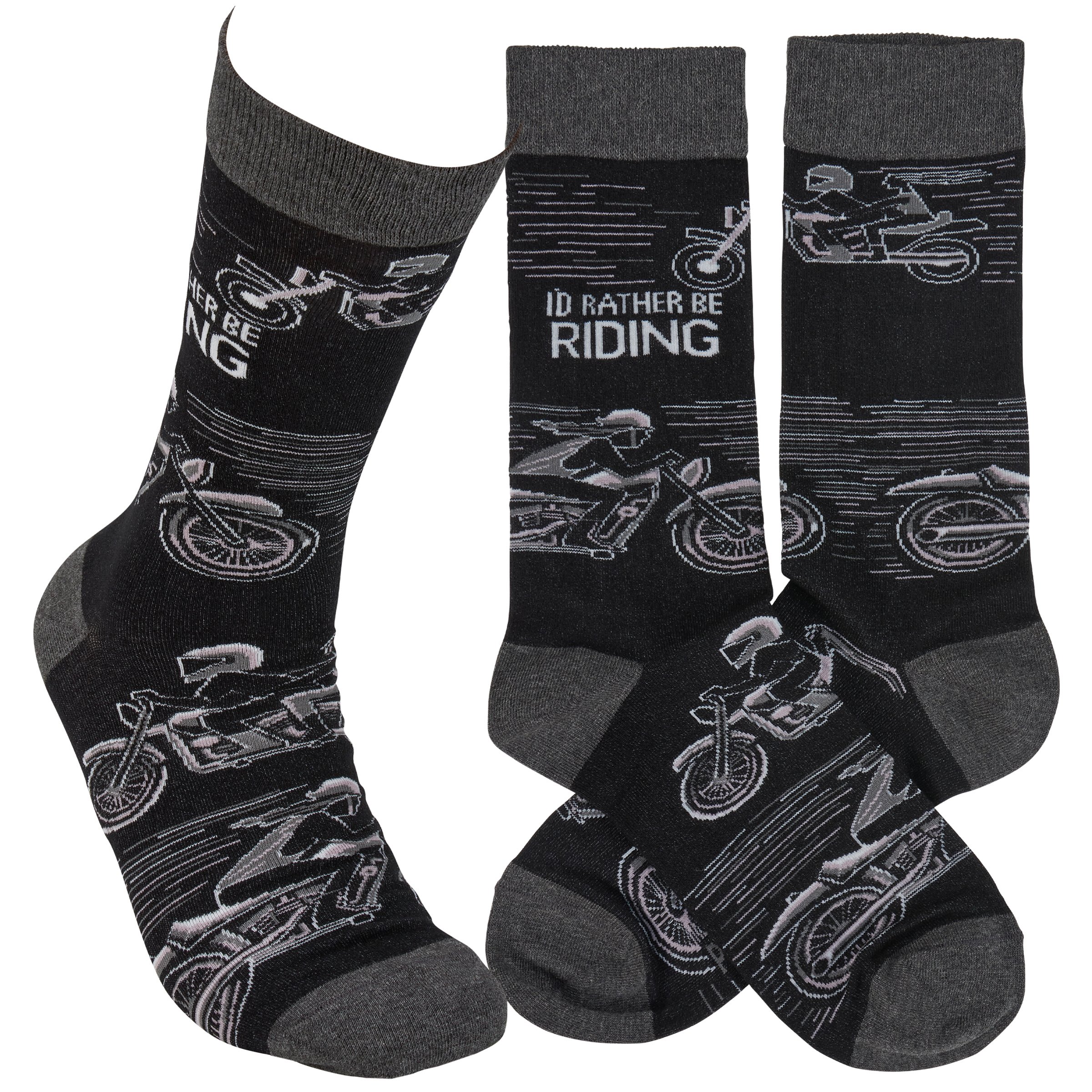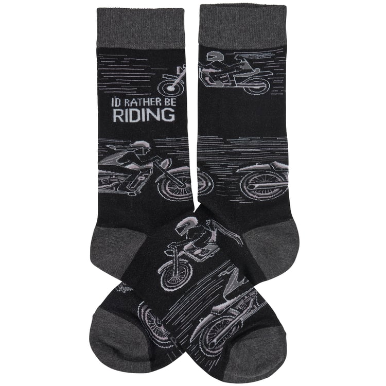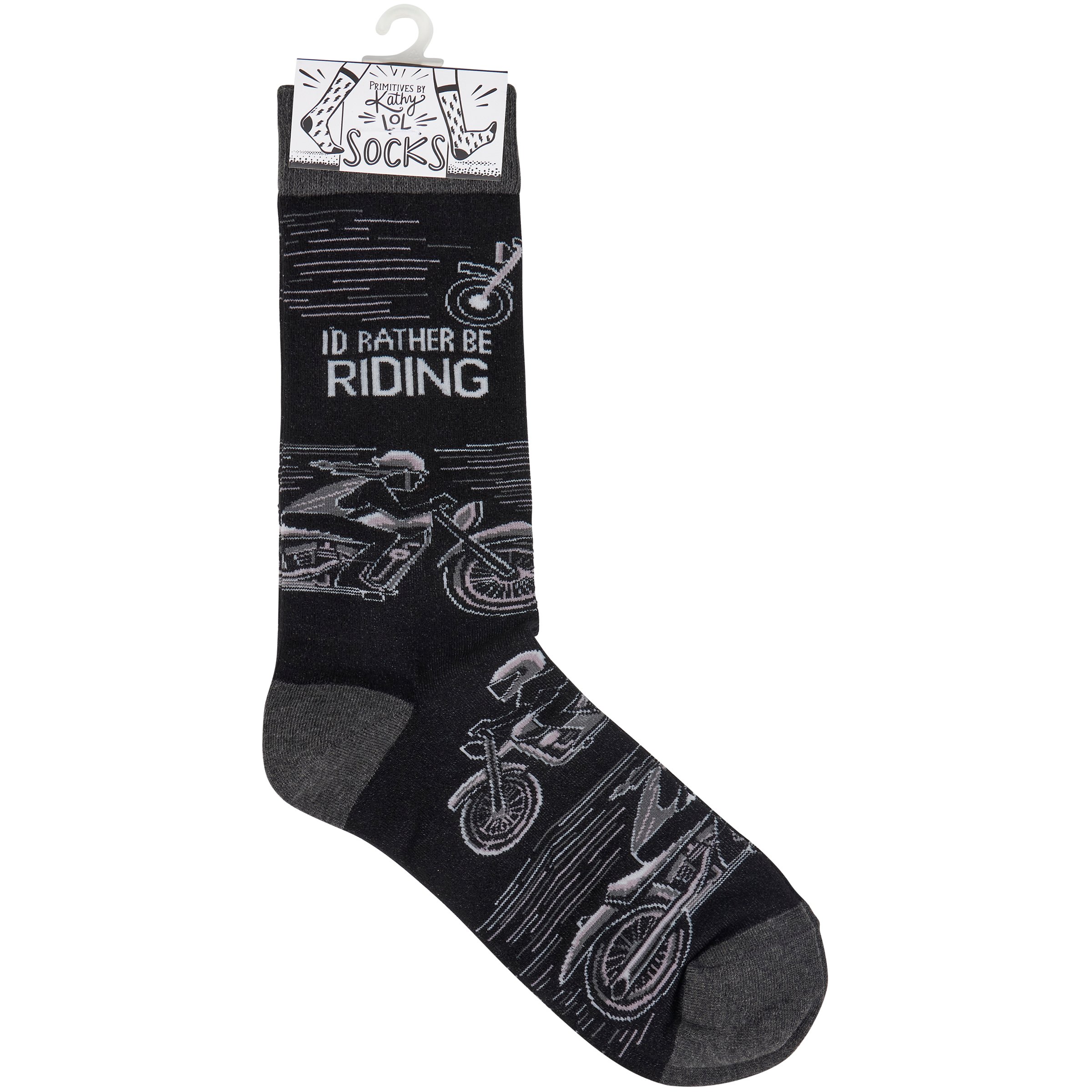 A pair of black and white socks from our LOL-Made You Smile Collection displaying unique hand illustrated designs of motorcycle riders with a fun sentiment that reads "I'd Rather Be Riding." Socks feature a one size fits most design made with cotton, nylon, and spandex. Our Rather Be Riding socks come with a header card and a clear plastic hanger for display. A fun biker-themed gift perfect for everyday self-expression.
