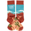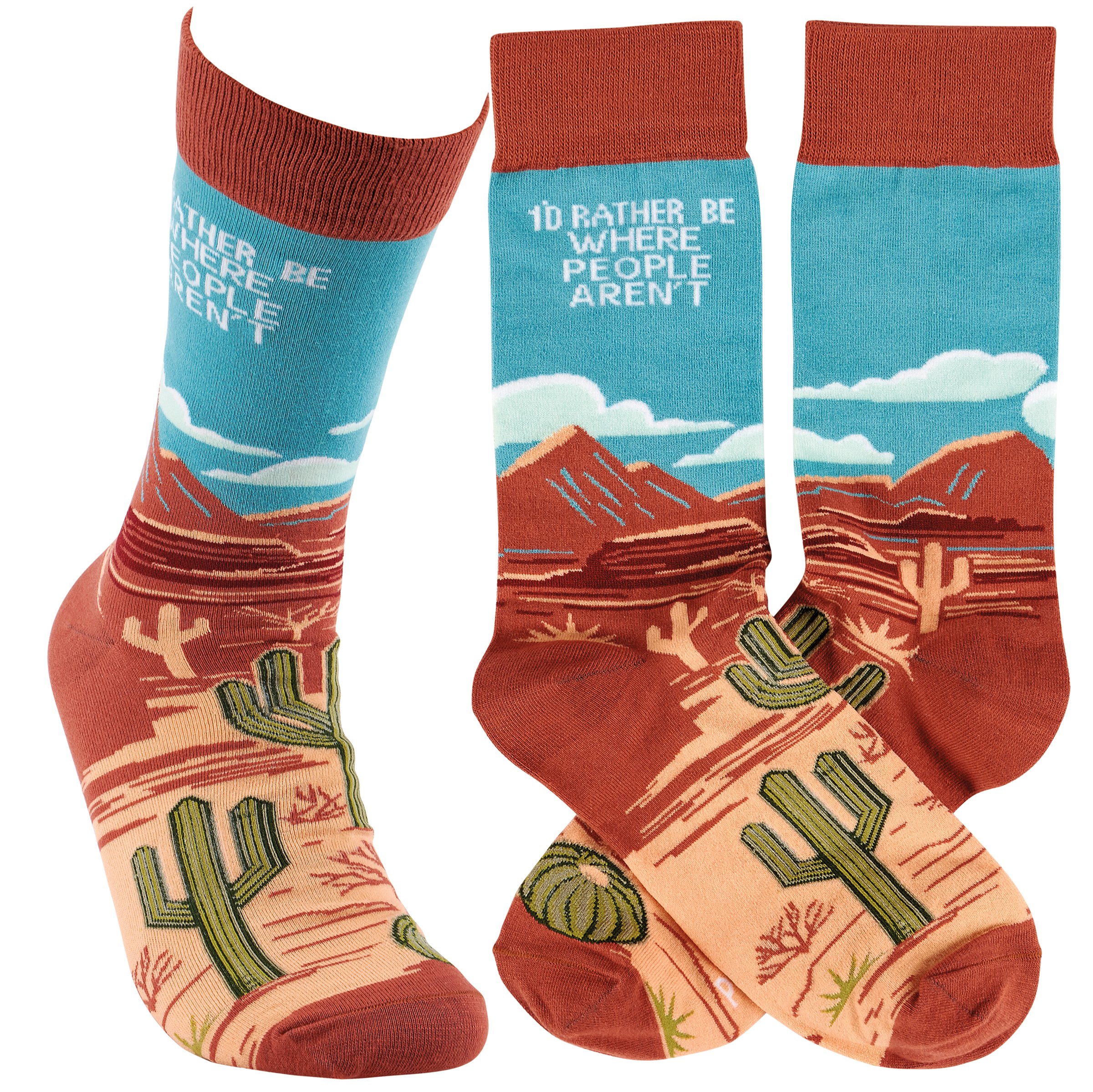A pair of colorful socks from our LOL-Made You Smile Collection displaying a playful hand illustrated design of the desert with a fun sentiment that reads "I'd Rather Be Where People Aren't." These giftable socks are made with a cotton, nylon, and spandex blend for a one size fits most design. Our Rather Be Where People Aren't socks come with a decorative header card and a clear plastic hanger for easy rack display and gifting. A fun traveling-themed gift perfect for everyday self-expression.