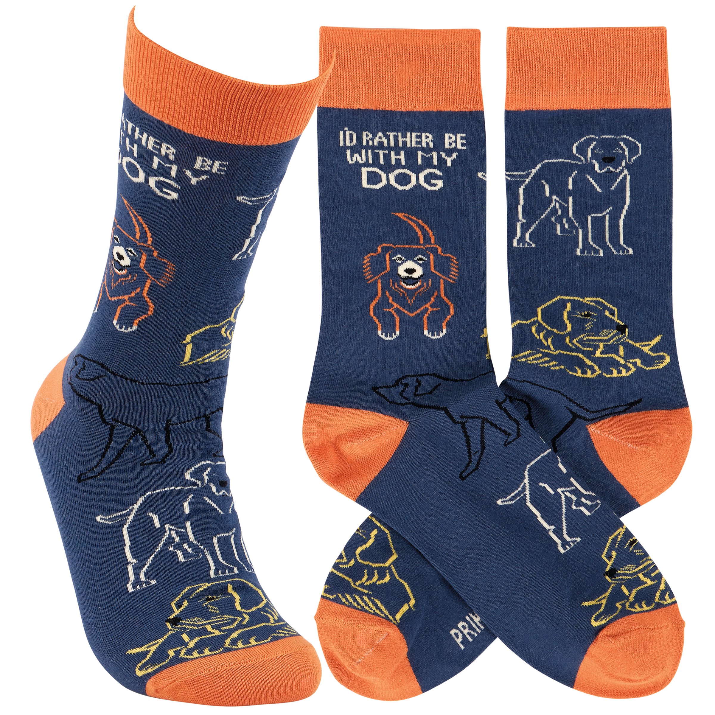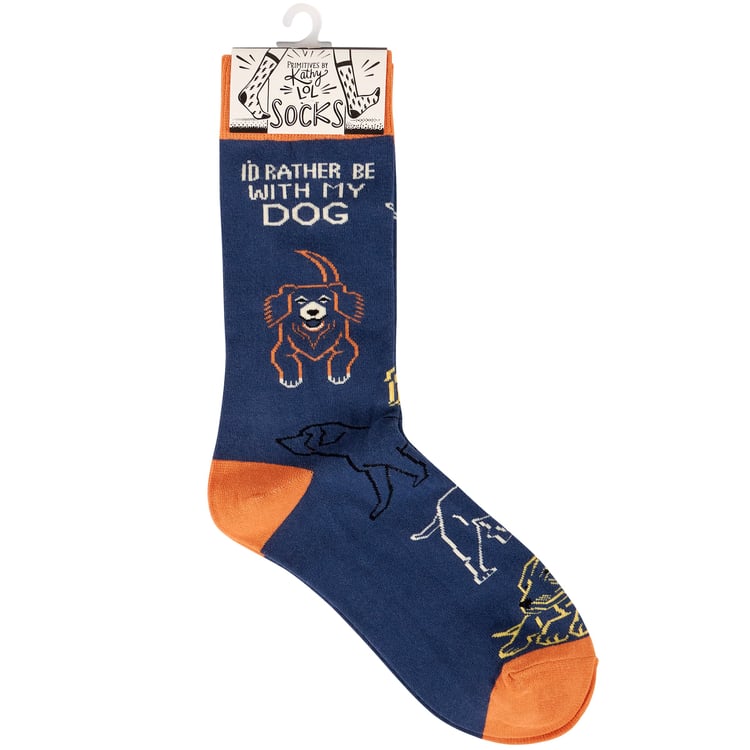 A pair of colorful socks from our Pet Collection displaying playful hand illustrated designs of various dogs with a fun pet inspired sentiment that reads "I'd Rather Be With My Dog." These giftable socks are made with a cotton, nylon, and spandex blend for a one size fits most design. Our Rather Be With My Dog socks come with a decorative header card and a clear plastic hanger for easy rack display and gifting. A fun dog-themed gift perfect for everyday self-expression.