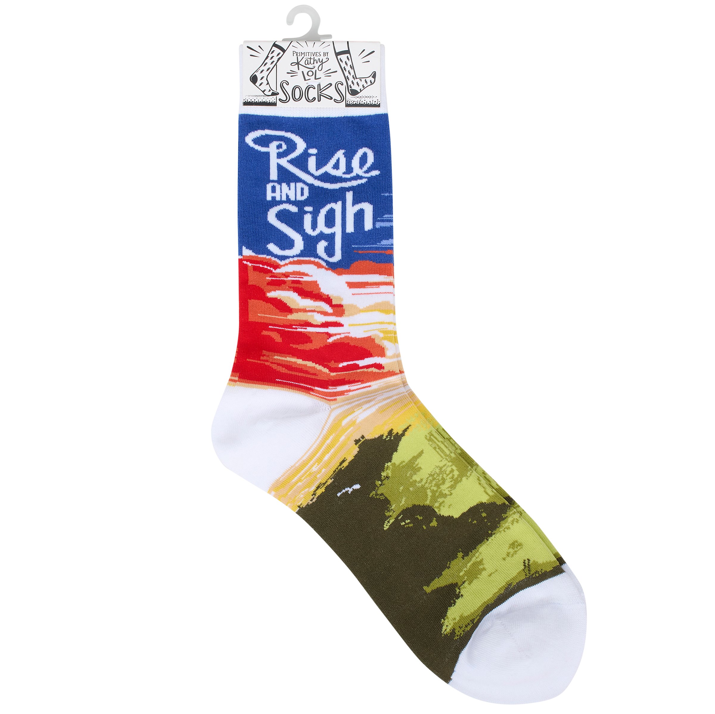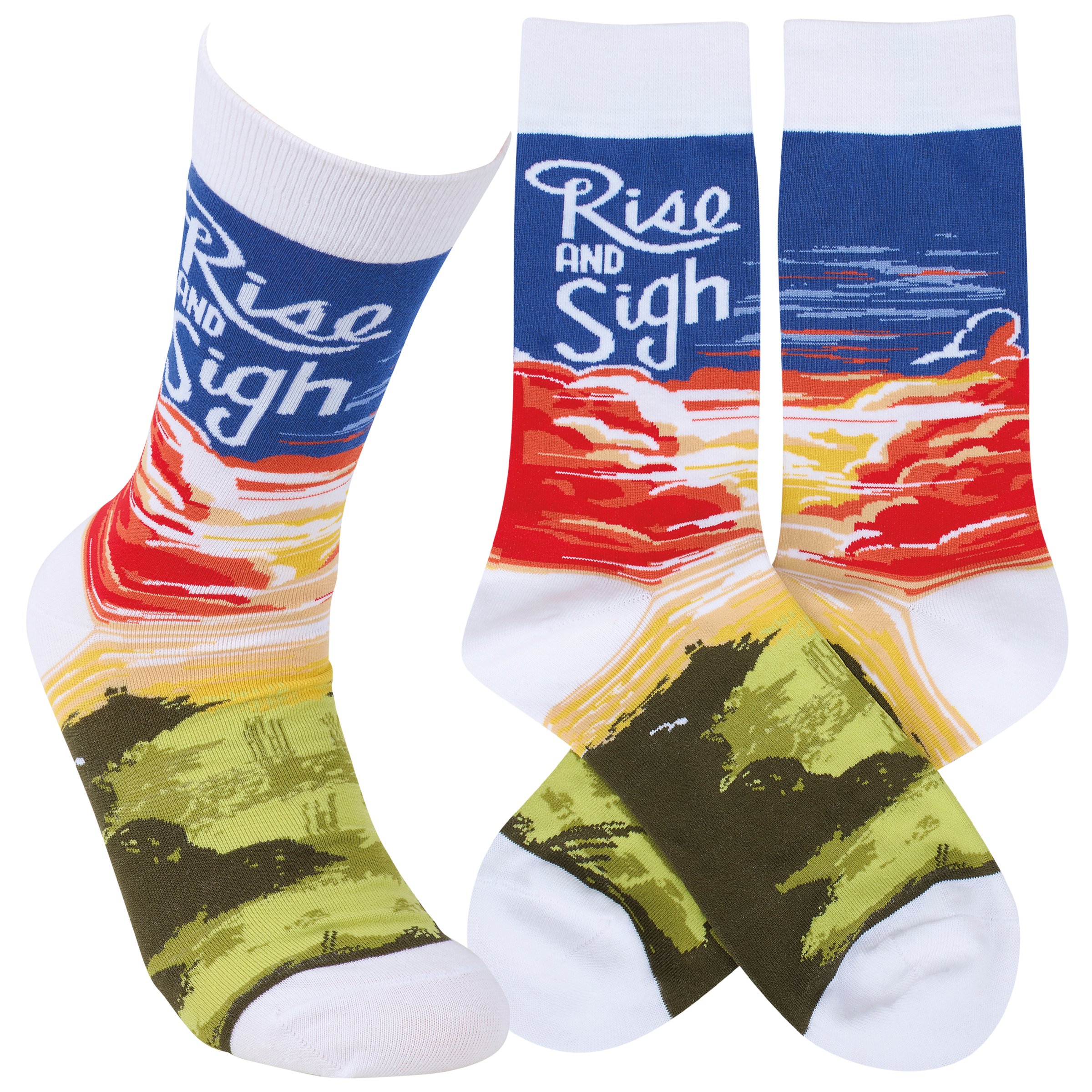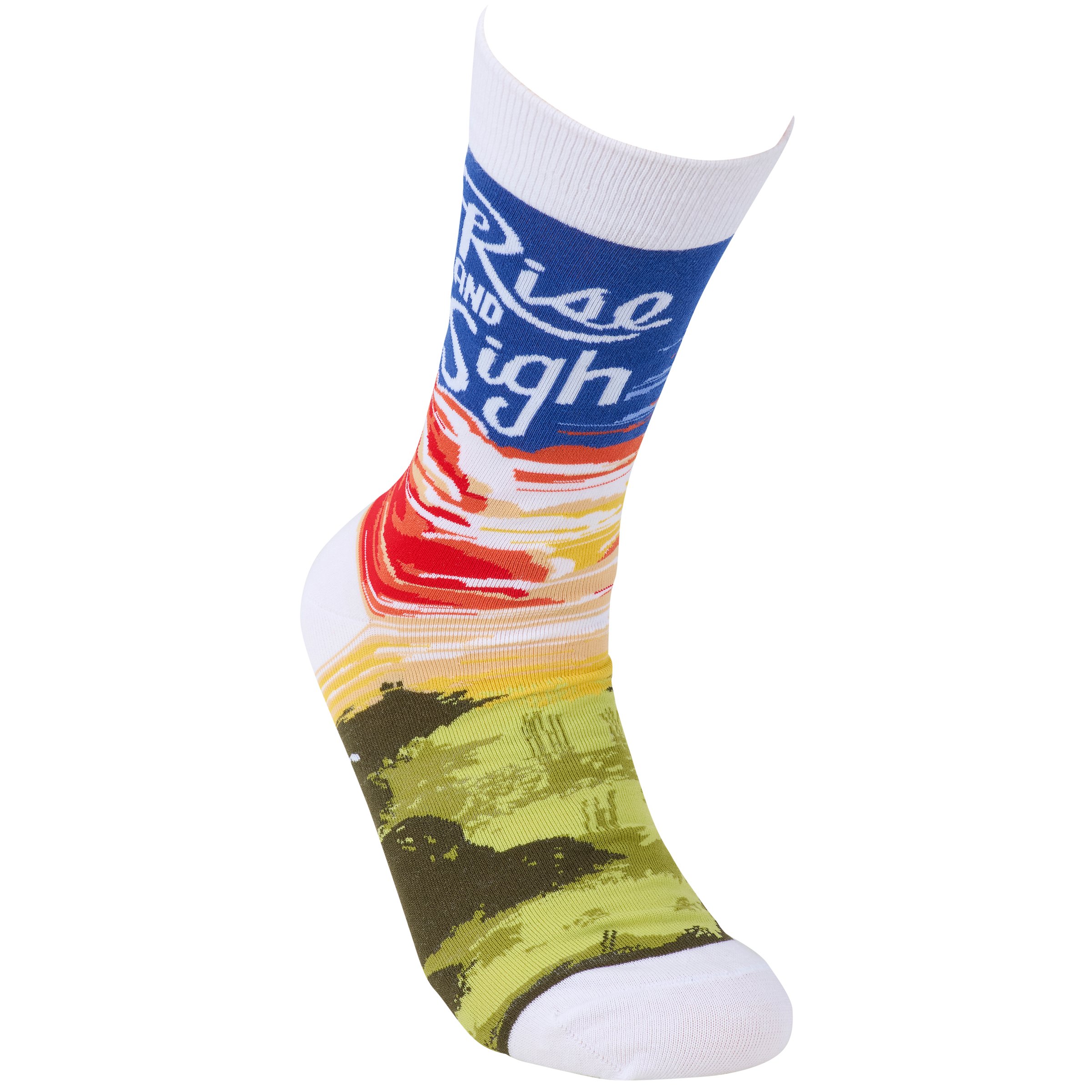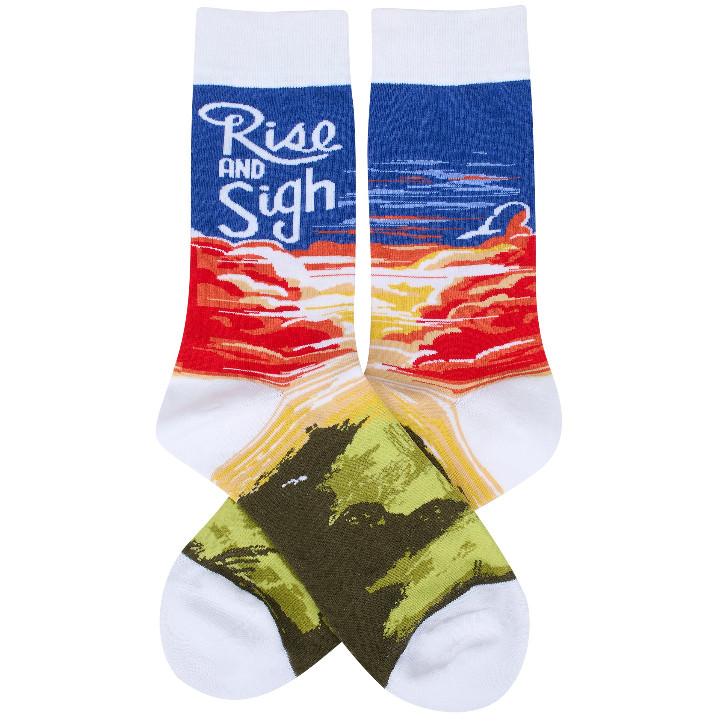 A pair of colorful socks from our LOL-Made You Smile Collection displaying a playful hand illustrated design of an inspirational sunrise with a sarcastic sentiment that reads "Rise And Sigh." These giftable socks are made with a cotton, nylon, and spandex blend for a one size fits most design. Our Rise And Sigh socks come with a decorative header card and a clear plastic hanger for easy rack display and gifting. A funny gift perfect for everyday self-expression.