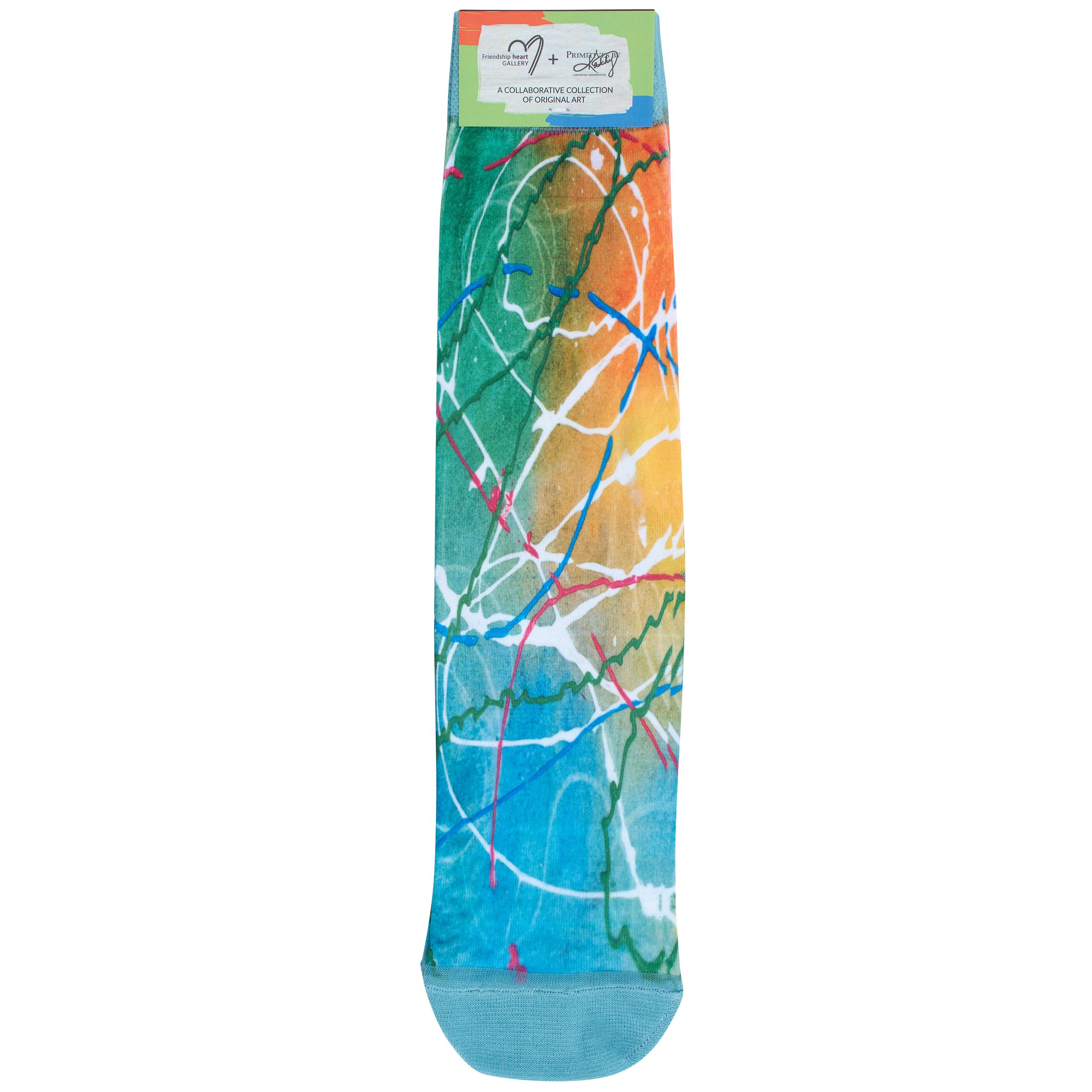 A pair of colorful socks from our Friendship Heart Gallery Collection featuring an all-over design displaying original art inspired by rope candy created at the Friendship Heart Gallery in Lancaster, PA which supports artists with intellectual disabilities and autism. Artist socks also feature blue color accents on the cuff, heel, and toe. These giftable socks are made with a spandex blend for a one size fits most design. Our Rope Candy socks come with a decorative header card and a clear plastic hanger for easy rack display and gifting. A thoughtful gift that supports artists in local communities. Perfect for mismatching with other colorful socks to wear during Rock Your Socks events. On March 21st people all around the world come together every year and celebrate World Down Syndrome Day by wearing brightly colored, mismatched socks to represent the unique talents and abilities of people with Down syndrome.