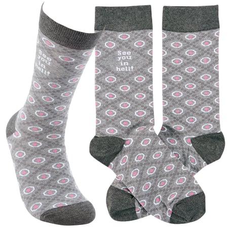 A pair of retro socks from our Trash Talk By Annie Collection flaunting a classy pink and gray pattern with a humorous sentiment that reads "See You In Hell!" These cozy socks are made with cotton, nylon, and spandex to create a one-size-fits-most design. Each pair of socks are packaged on a clear plastic hanger with header card for graceful display in store. Our See You socks call back to a vintage style with modern sassy sentiments, perfect for making a statement while getting a giggle out of others. Colorful and cozy socks always make a great gift for everyday self-expression.