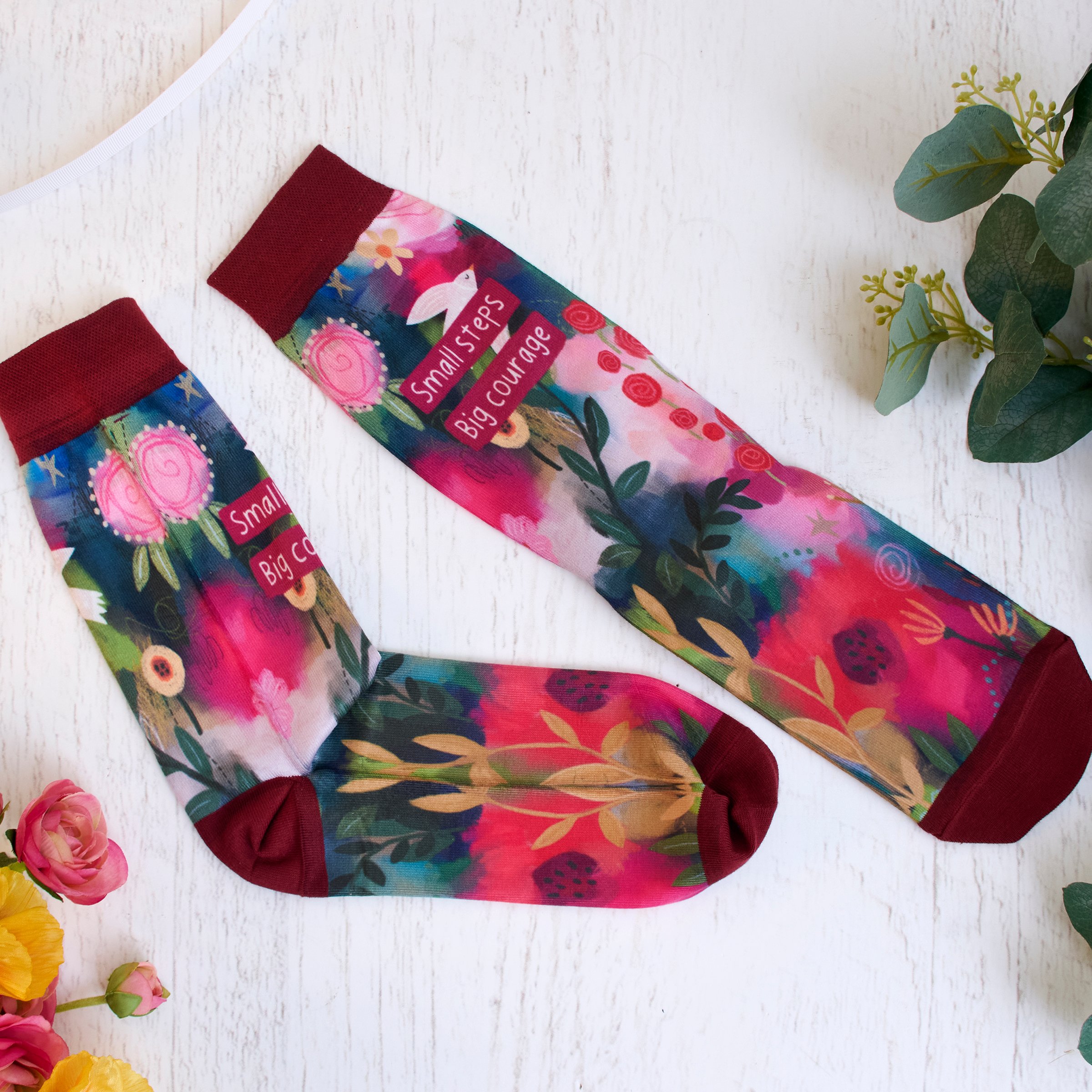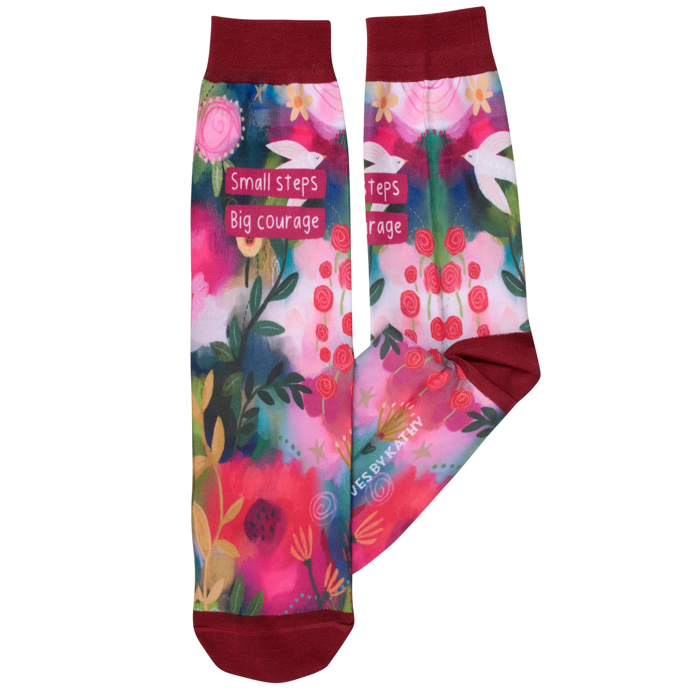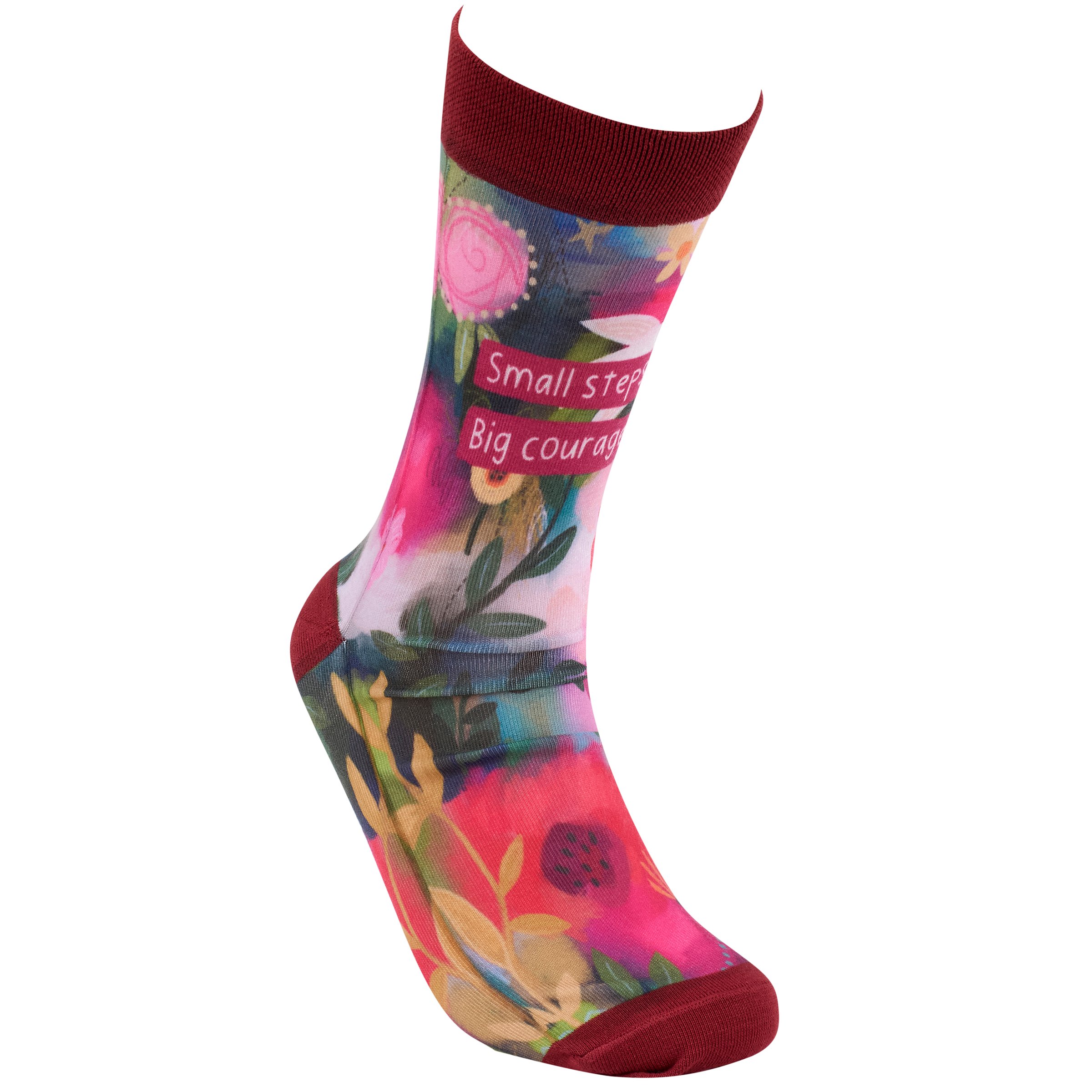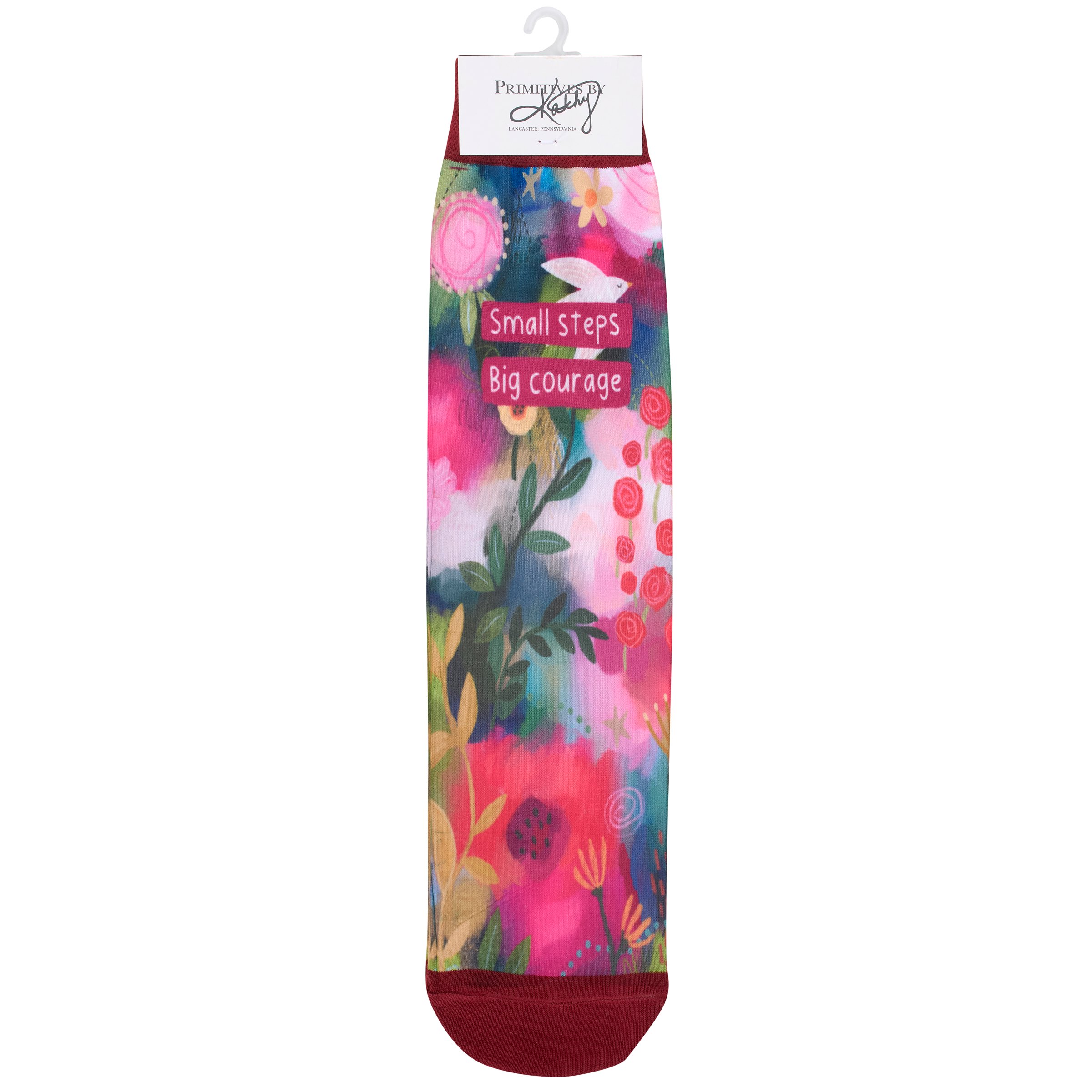 A pair of colorful socks from our Inspiration & Blooms Collection displaying a full-color design of abstract florals and birds with an inspirational sentiment that reads "Small Steps Big Courage." Floral design is digitally printed replicating original hand illustrated artwork with red color accents on the cuff, heel, and toe. These giftable socks are made with a spandex blend for a one size fits most design. Our Small Steps Big Courage socks come with a decorative header card and a clear plastic hanger for easy rack display and gifting. An inspirational gift perfect for everyday self-expression.