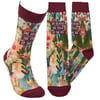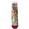 A pair of colorful socks from our Inspiration & Blooms Collection displaying a full-color design of abstract florals with an inspirational sentiment that reads "She Believed She Could So She Did." Floral design is digitally printed replicating original hand illustrated artwork with red color accents on the cuff, heel, and toe. These giftable socks are made with a spandex blend for a one size fits most design. Our So She Did socks come with a decorative header card and a clear plastic hanger for easy rack display and gifting. An inspirational gift perfect for everyday self-expression.
