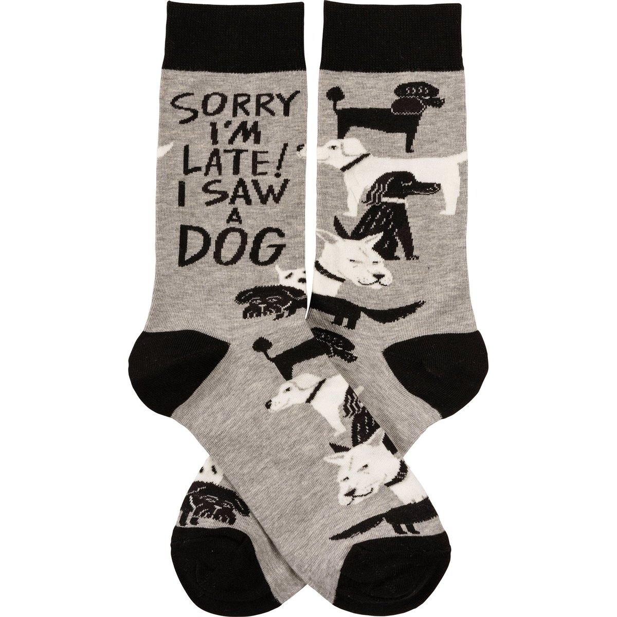 These colorful socks from our LOL Made You Smile Collection feature woven designs with coordinating "Sorry I'm Late! I Saw A Dog" sentiment. Cotton, nylon, spandex. These I Saw A Dog socks are one size fits most.
