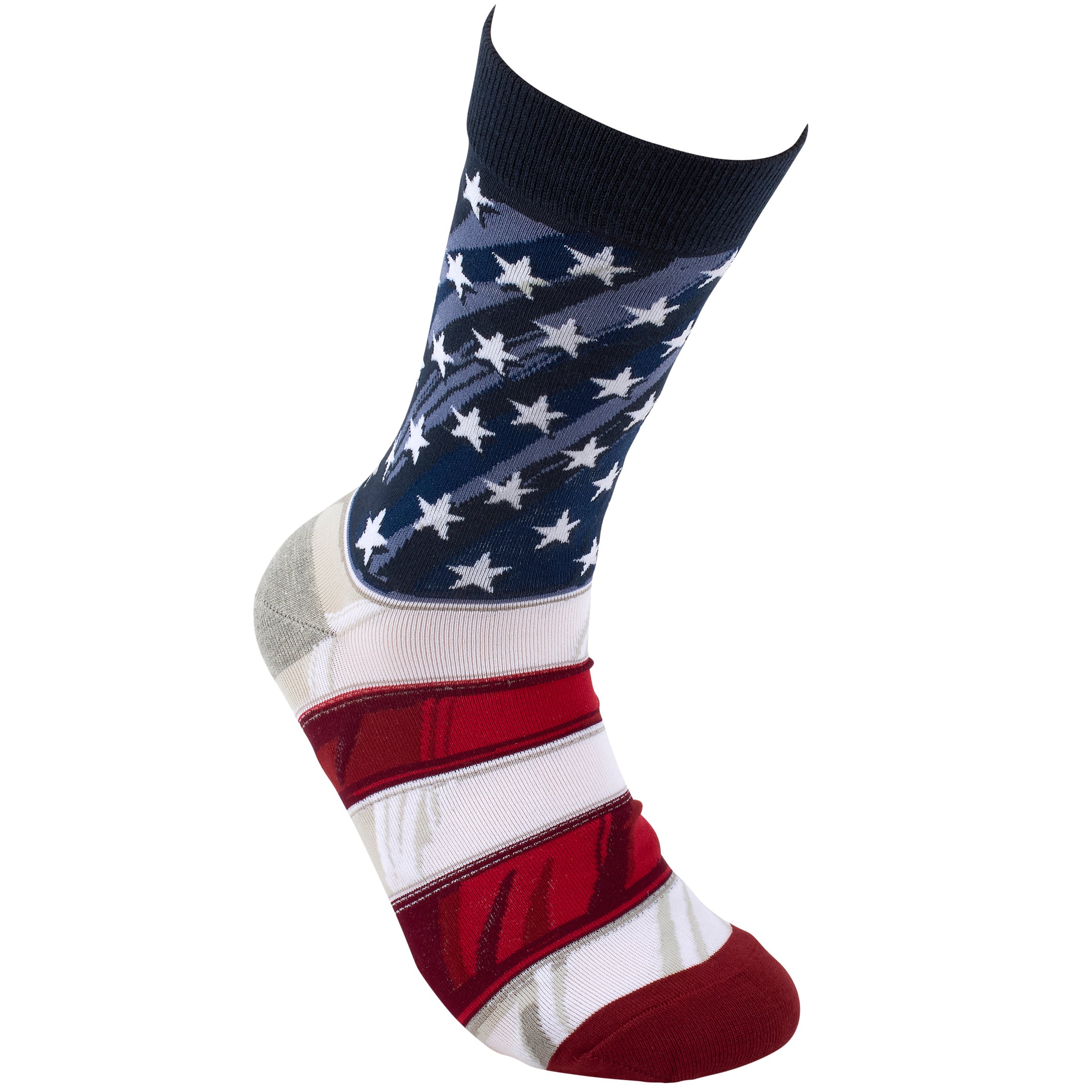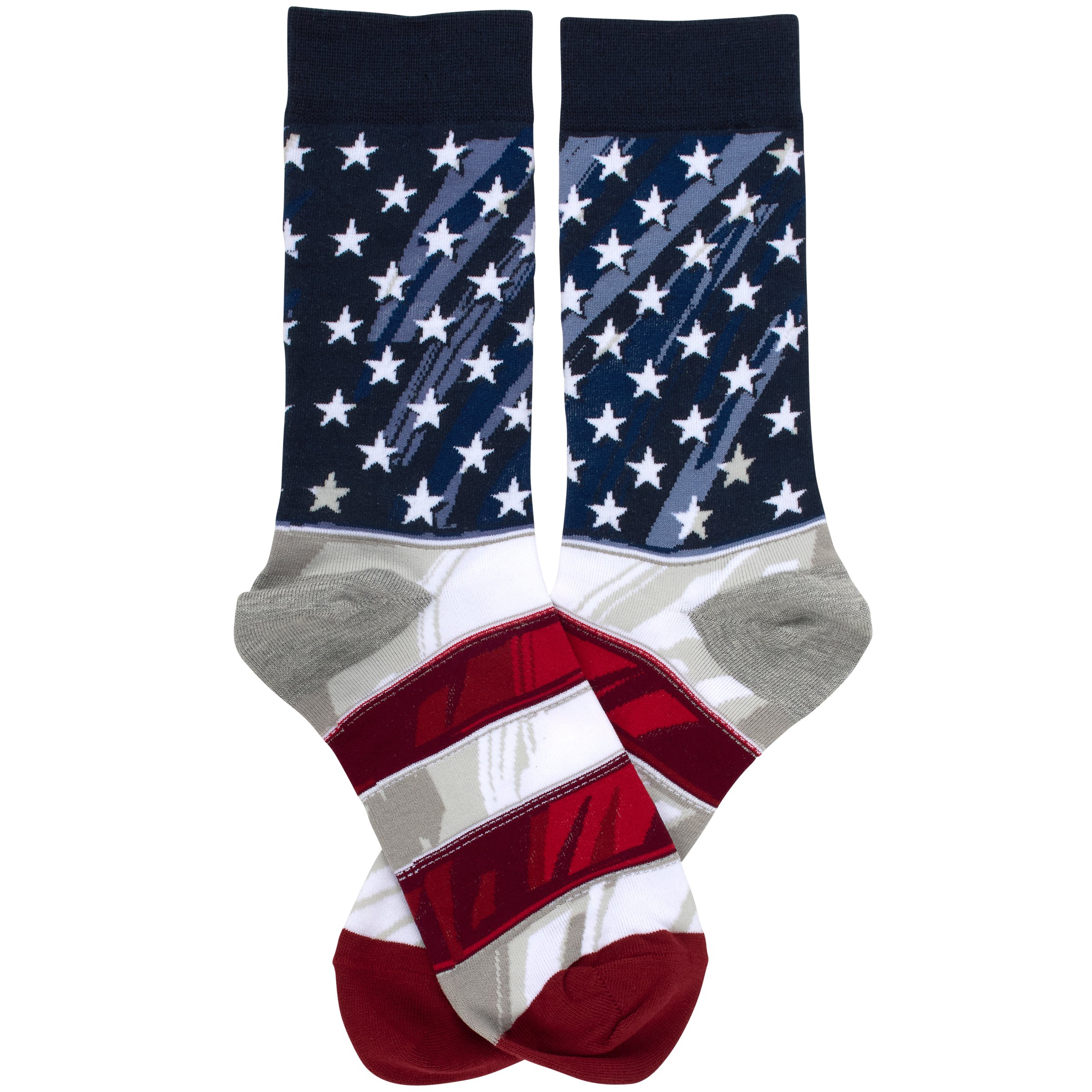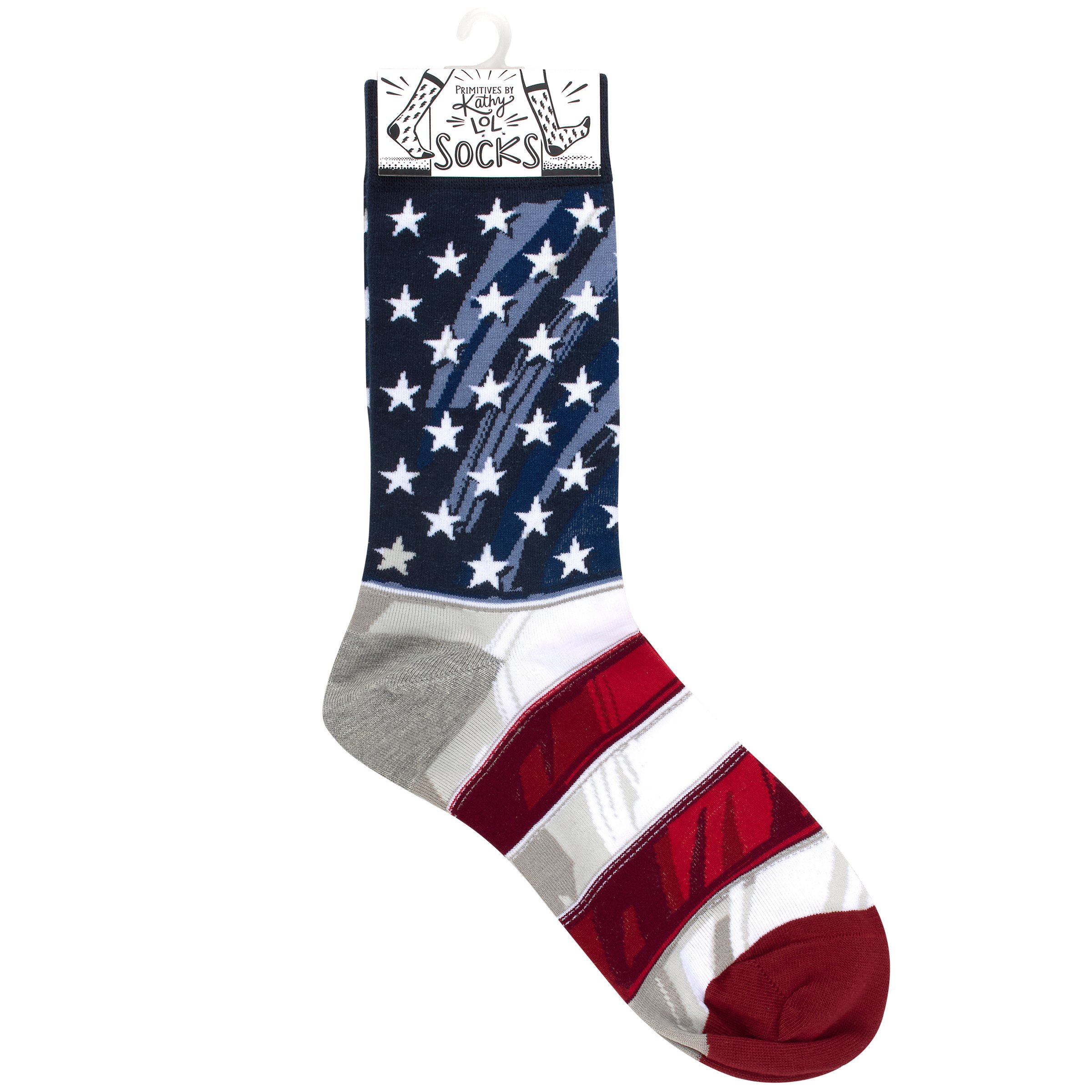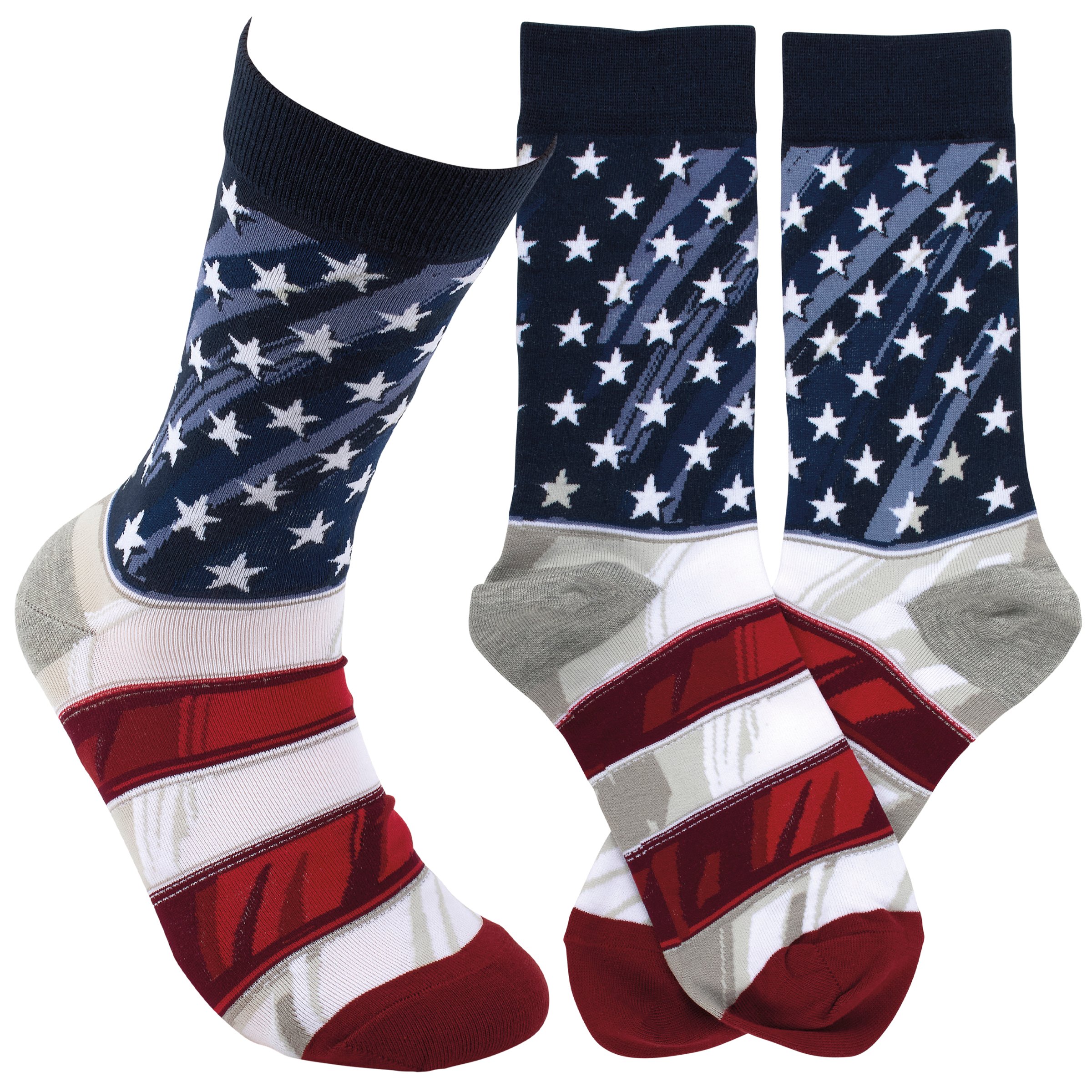 A pair of colorful socks from our Patriotic Collection displaying a playful hand illustrated design of the American flag with stars on the legs and stripes on the feet. These giftable socks are made with a cotton, nylon, and spandex blend for a one size fits most design. Our Stars And Stripes socks come with a decorative header card and a clear plastic hanger for easy rack display and gifting. A patriotic accessory perfect for seasonal style during 4th of July and Memorial Day or celebrating stars and stripes all year-round.