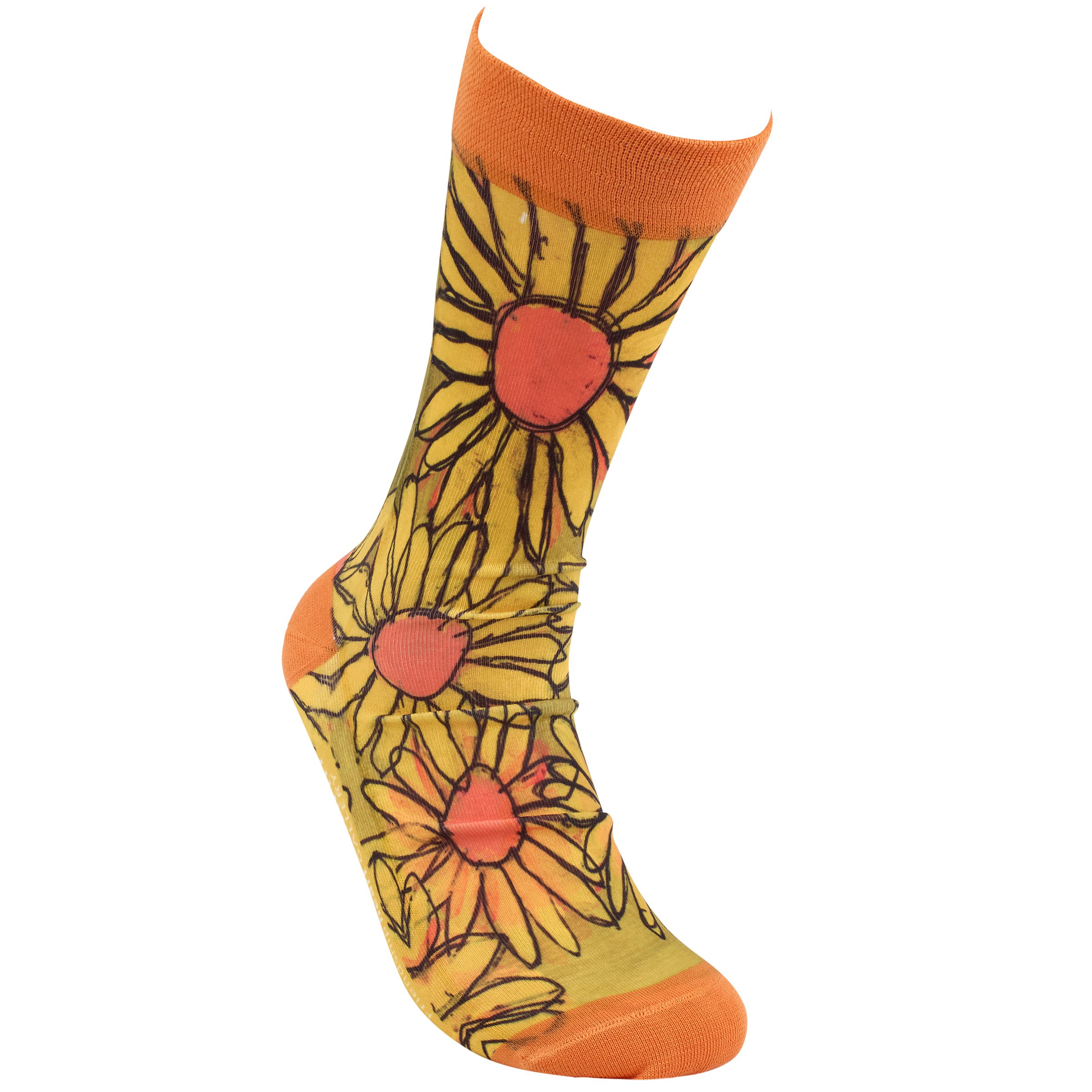 A pair of colorful socks from our Friendship Heart Gallery Collection featuring an all-over design displaying original art of sunflowers created at the Friendship Heart Gallery in Lancaster, PA which supports artists with intellectual disabilities and autism. Artist socks also feature orange color accents on the cuff, heel, and toe. These giftable socks are made with a spandex blend for a one size fits most design. Our Sunflowers socks come with a decorative header card and a clear plastic hanger for easy rack display and gifting. A thoughtful gift that supports artists in local communities. Perfect for mismatching with other colorful socks to wear during Rock Your Socks events. On March 21st people all around the world come together every year and celebrate World Down Syndrome Day by wearing brightly colored, mismatched socks to represent the unique talents and abilities of people with Down syndrome.