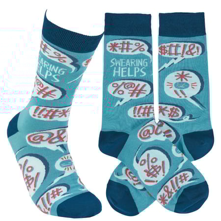 A pair of colorful socks from our LOL-Made You Smile Collection displaying unique hand illustrated designs of swearing word bubbles with a fun sentiment that reads "Swearing Helps." Socks feature a one size fits most design made with cotton, nylon, and spandex. Our Swearing Helps socks come with a header card and a clear plastic hanger for display. A fun gift perfect for everyday self-expression.