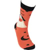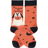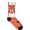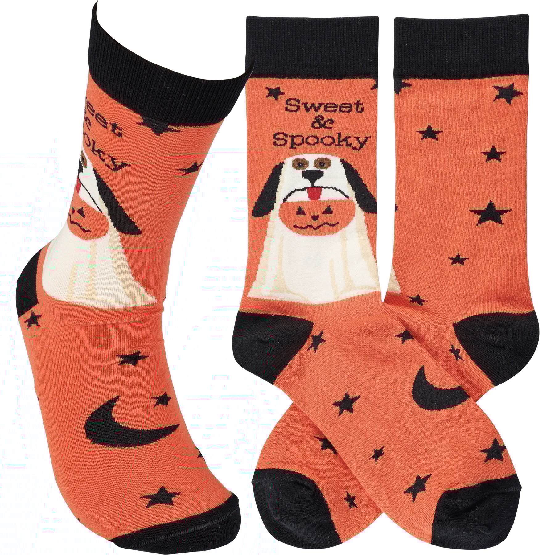 A pair of colorful woven socks from our Holiday Pet Collection displaying a rustic design of a dog wearing a ghost costume holding a treat bucket with "Sweet & Spooky" sentiment. Socks feature a one size fits most design made with cotton, nylon, and spandex. Our Sweet & Spooky socks come with a header card and a clear plastic hanger for display. A fun seasonal accessory perfect for self-expression or for gifting.