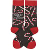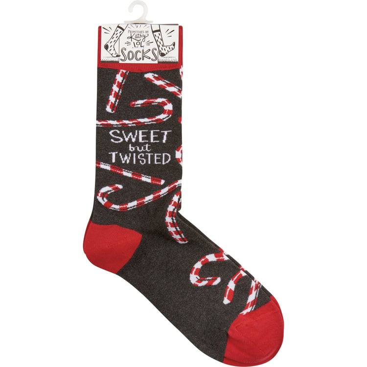 A pair of colorful woven socks from our Christmas Collection displaying unique hand illustrated designs of candy canes with humorous "Sweet But Twisted" sentiment. Socks feature a one size fits most design made with cotton, nylon, and spandex. Our Sweet But Twisted socks come with a header card and a clear plastic hanger for display. A fun seasonal accessory perfect for self-expression or for gifting.
