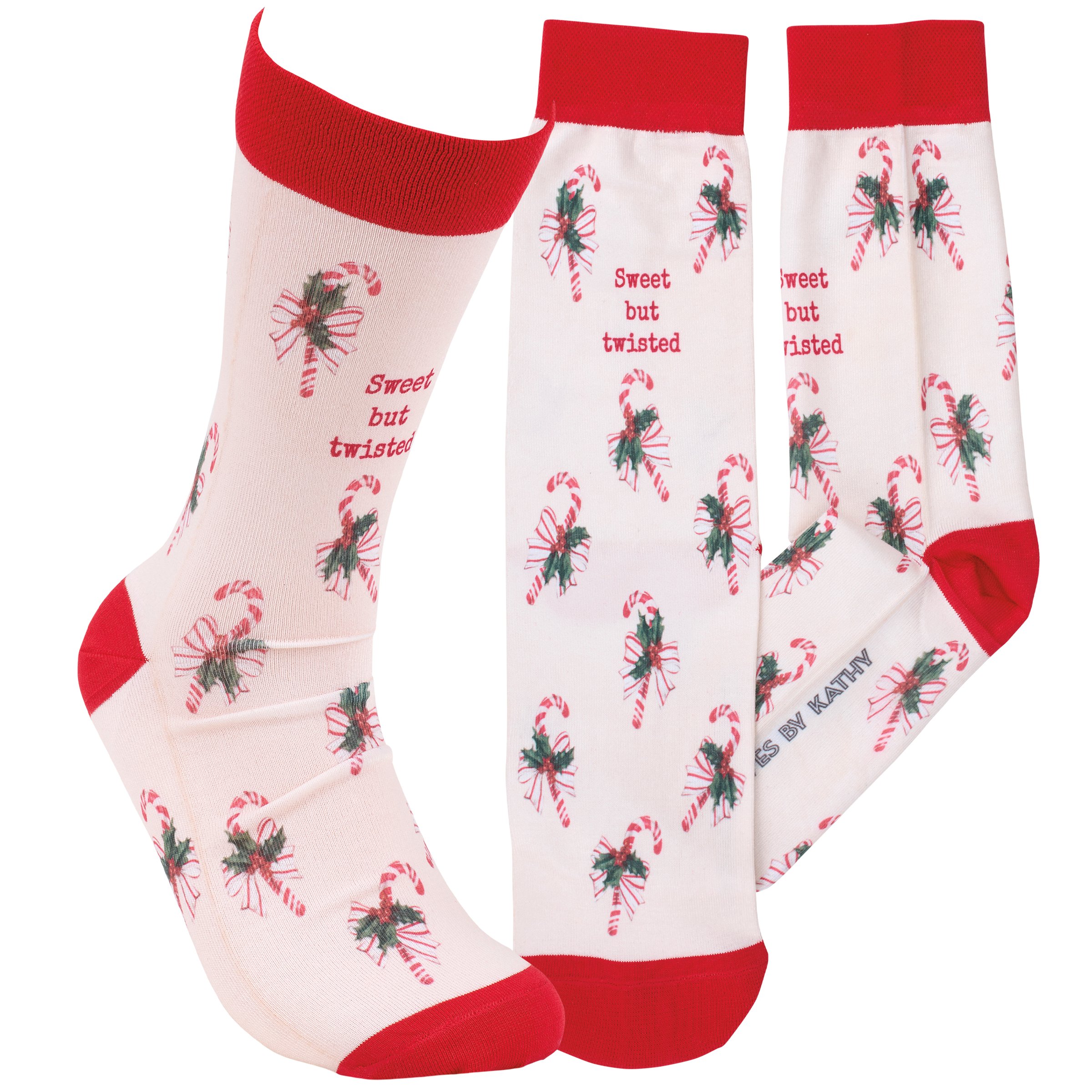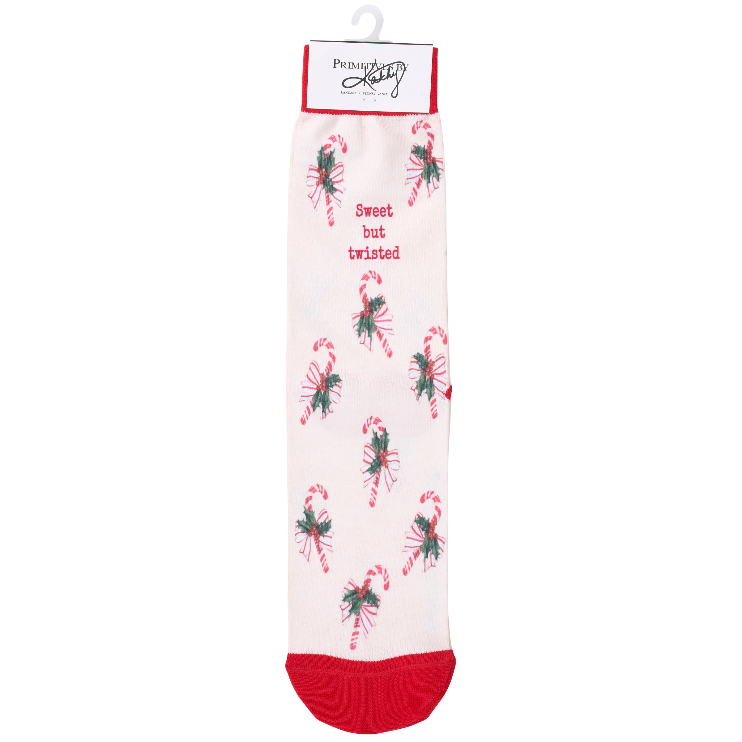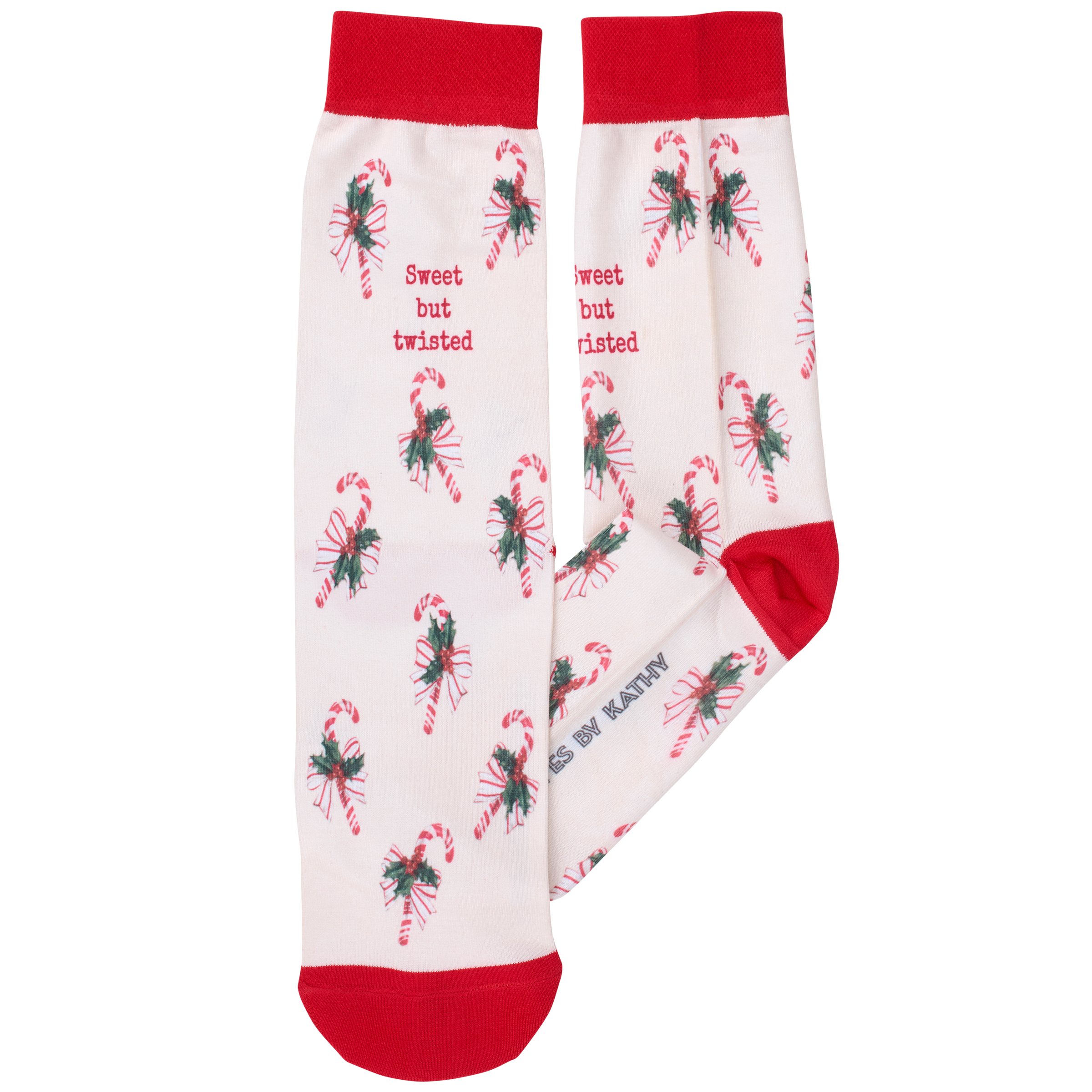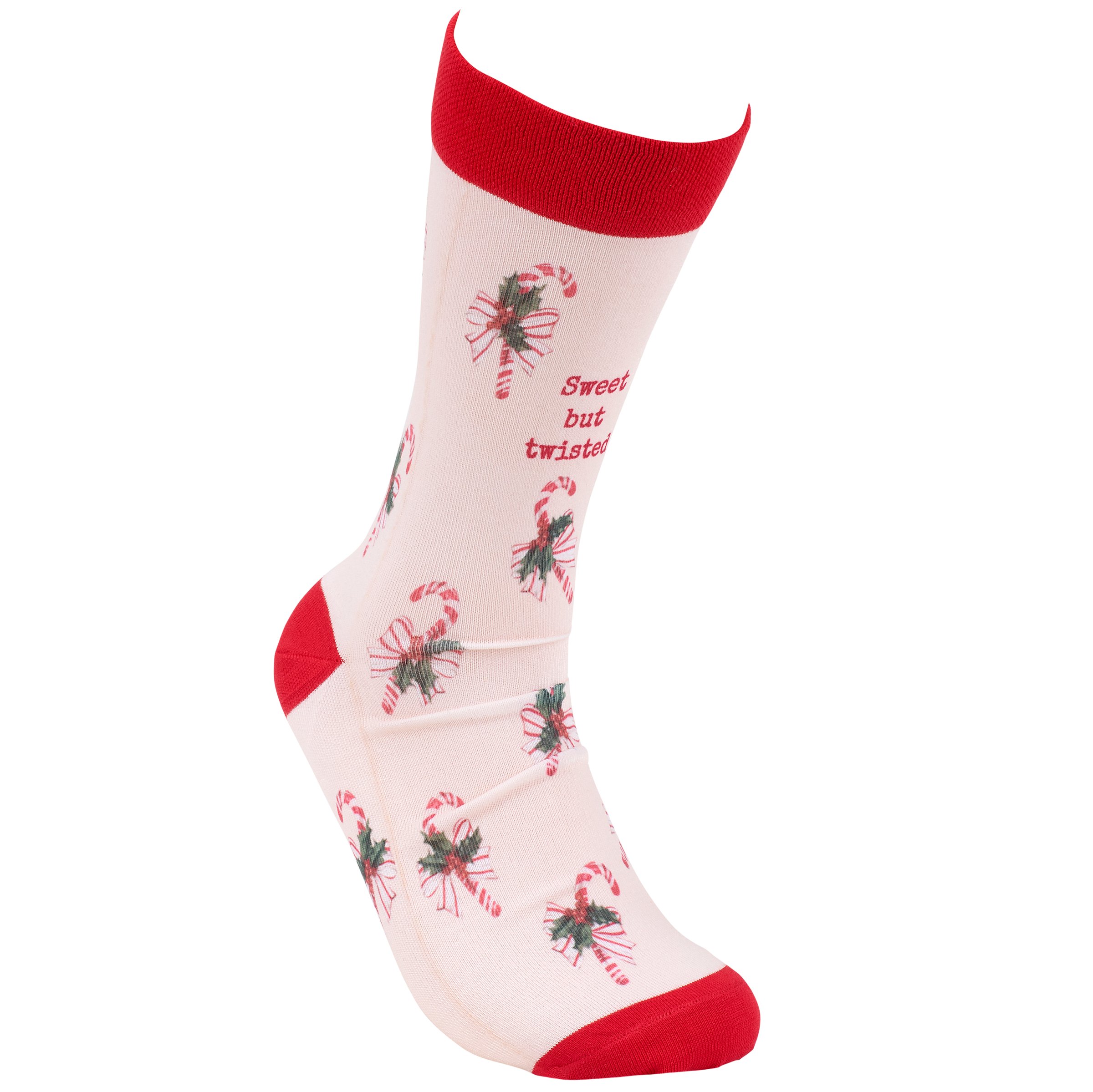 A pair of fun socks from our Christmas Collection featuring an all-over design displaying vintage art of candy canes with a fun seasonal sentiment on the front that reads "Sweet But Twisted" as well as red color accents on the cuff, heel, and toe. These giftable socks are made with a spandex blend for a one size fits most design. Our Sweet But Twisted socks come with a decorative header card and a clear plastic hanger for easy rack display and gifting. A fun Christmas gift perfect for seasonal self-expression.