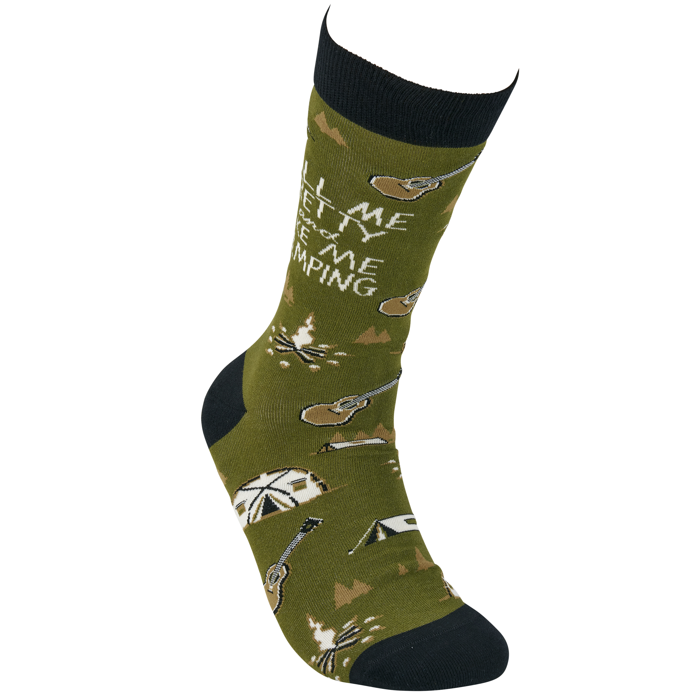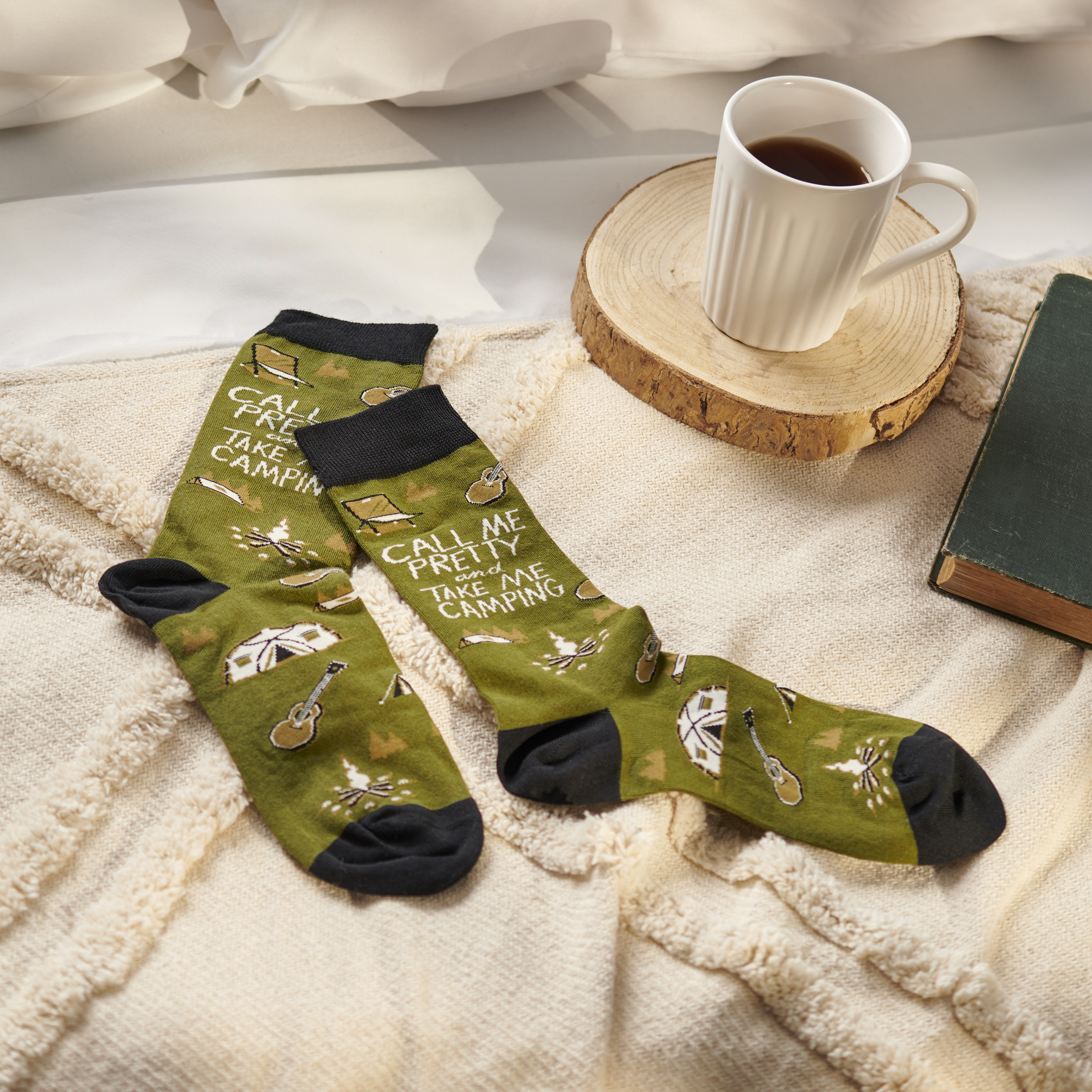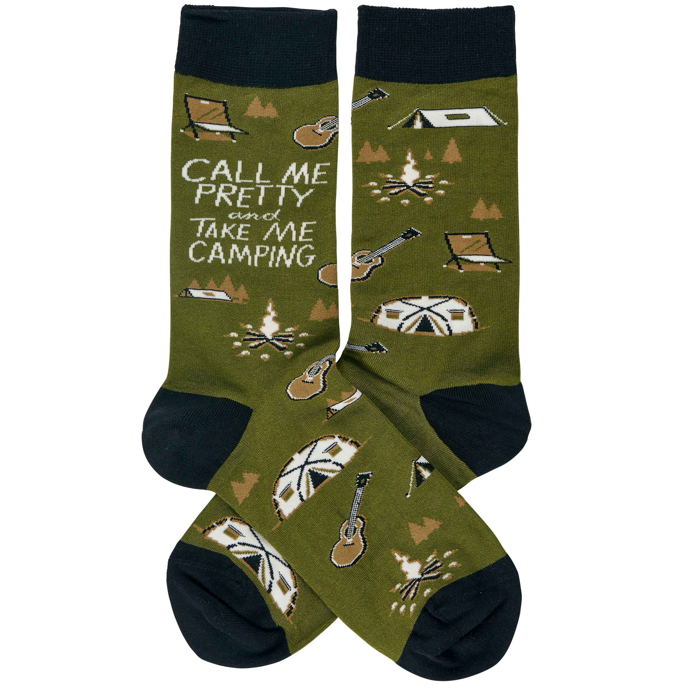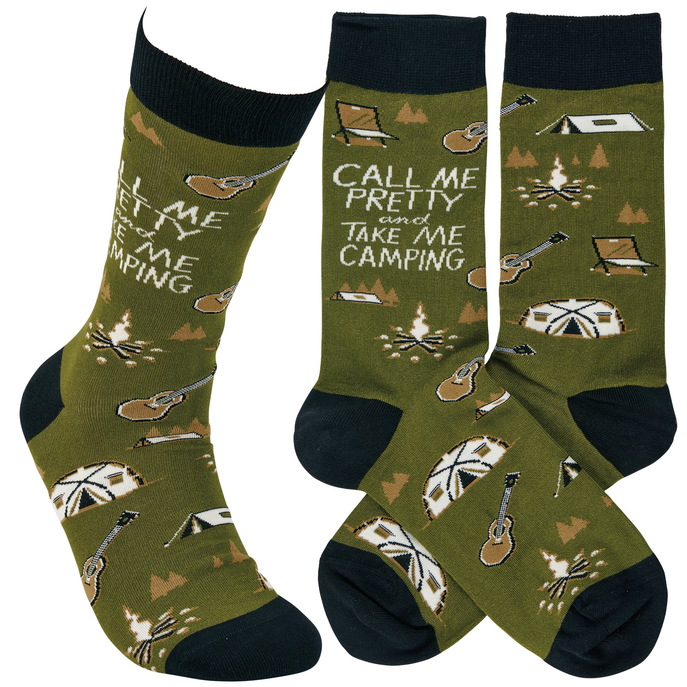 A pair of colorful socks from our Lake & Cabin Collection displaying unique hand illustrated designs of camping tents, campfires, and guitars with a fun camping-themed sentiment that reads "Call Me Pretty And Take Me Camping." Socks feature a one size fits most design made with cotton, nylon, and spandex. Our Take Me Camping socks come with a header card and a clear plastic hanger for display. A fun camping-themed gift perfect for everyday self-expression.