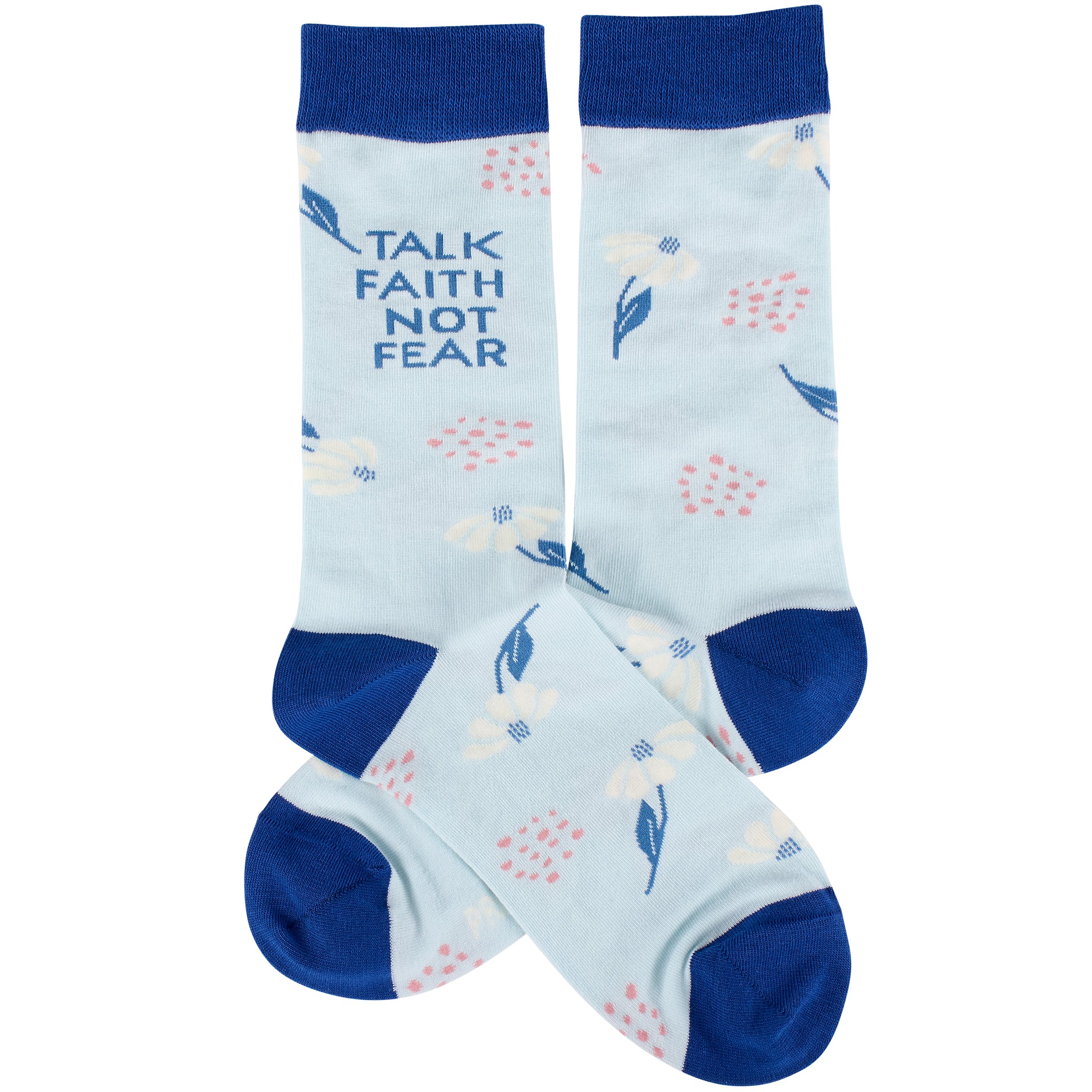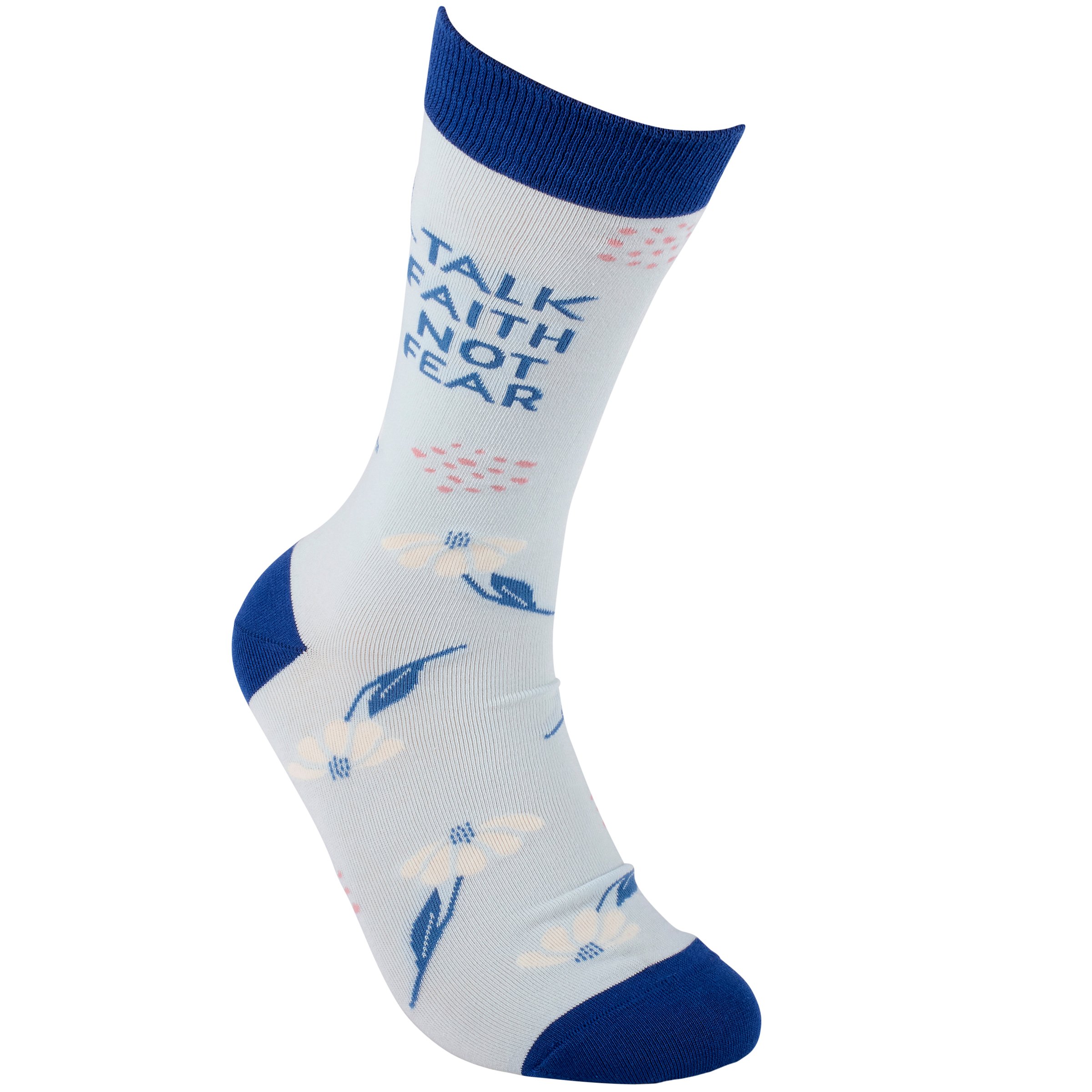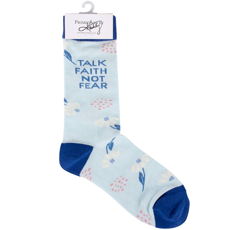 A pair of colorful socks from our Faith Collection displaying a beautiful pattern of white flowers with a faith inspired sentiment that reads "Talk Faith Not Fear." Flower designs are replicated from original hand illustrated art. These giftable socks are made with a cotton, nylon, and spandex blend for a one size fits most design. Our Talk Faith Not Fear socks come with a decorative header card and a clear plastic hanger for easy rack display and gifting. A faith-themed gift perfect for everyday self-expression.