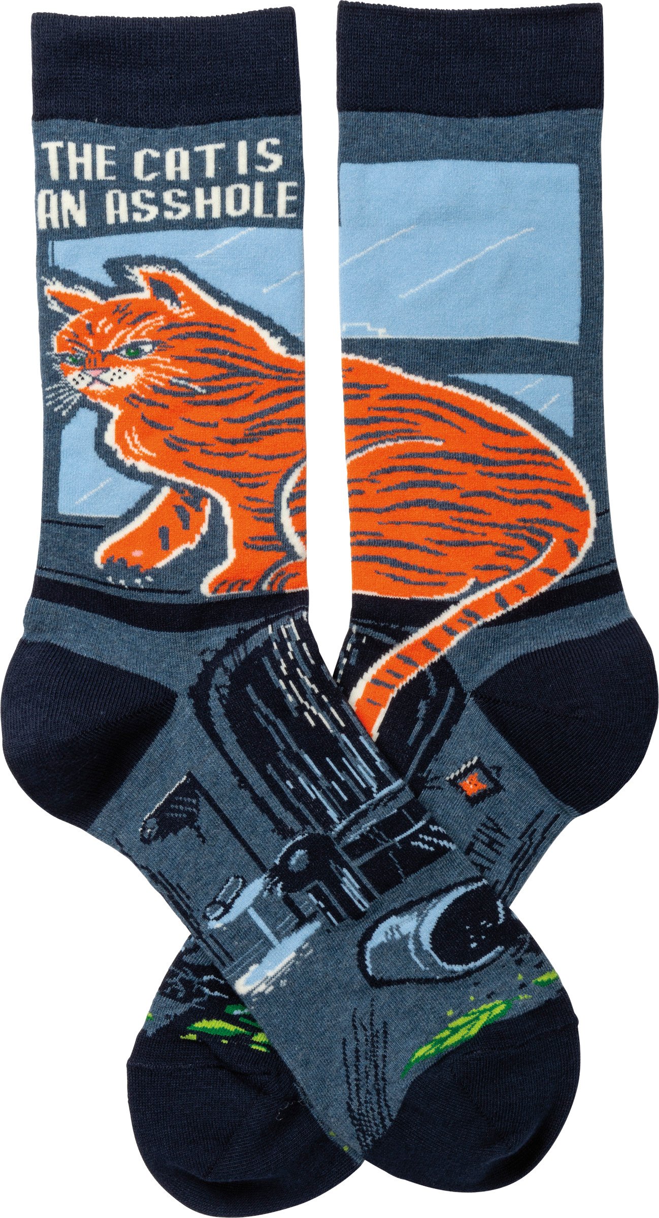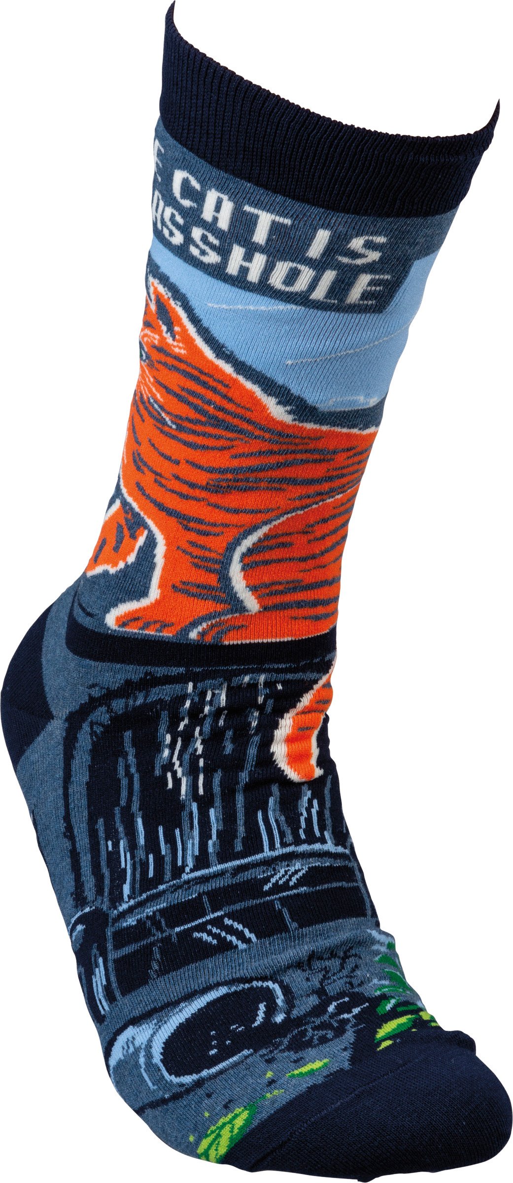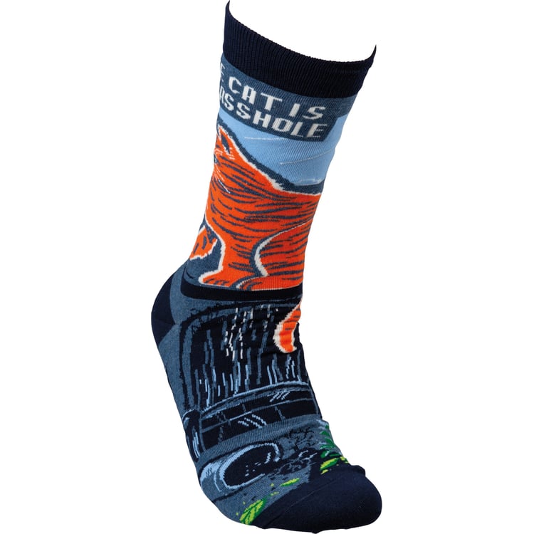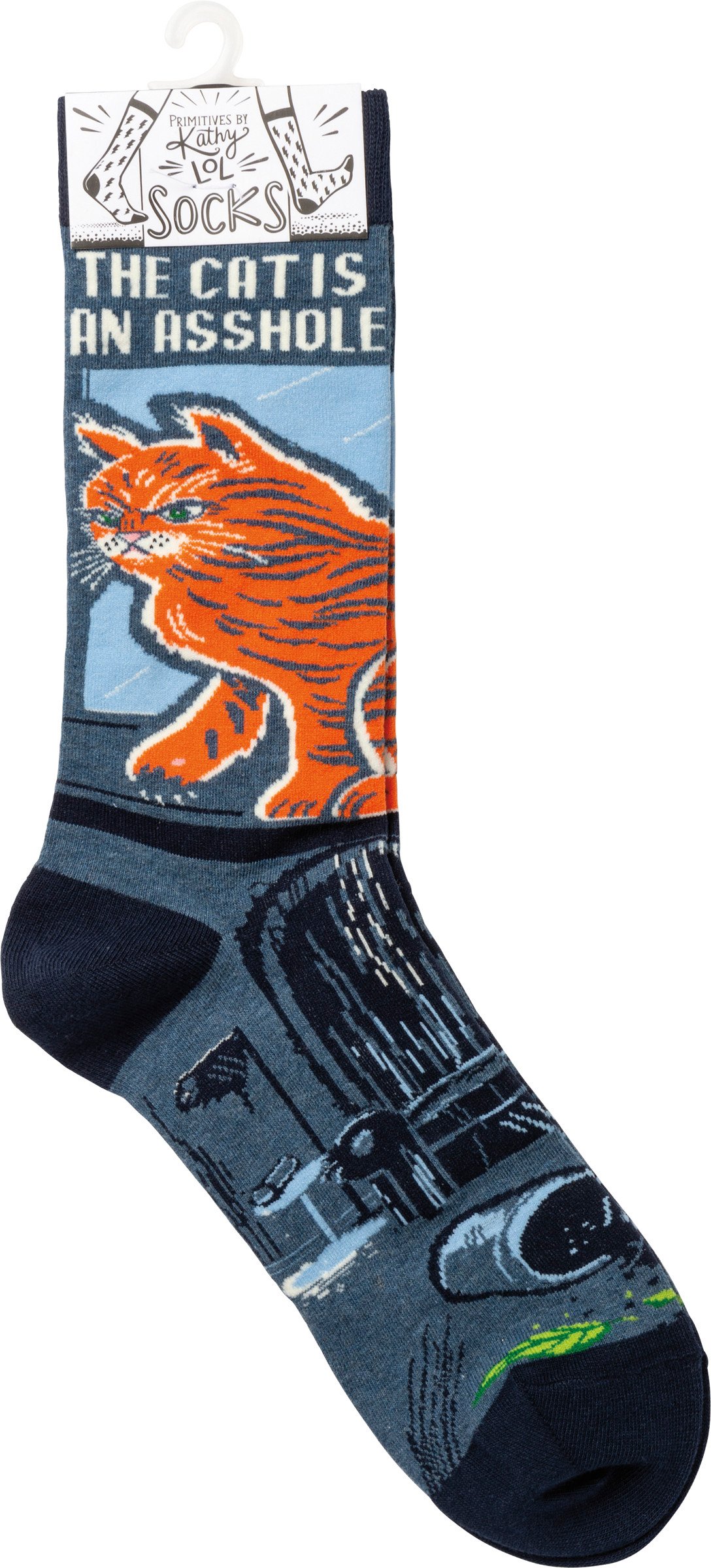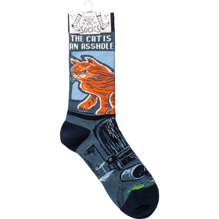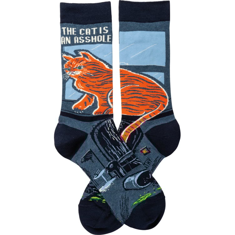These colorful socks feature woven designs with coordinating "The Cat Is An Asshole" sentiment. Cotton, nylon, spandex. One size fits most.