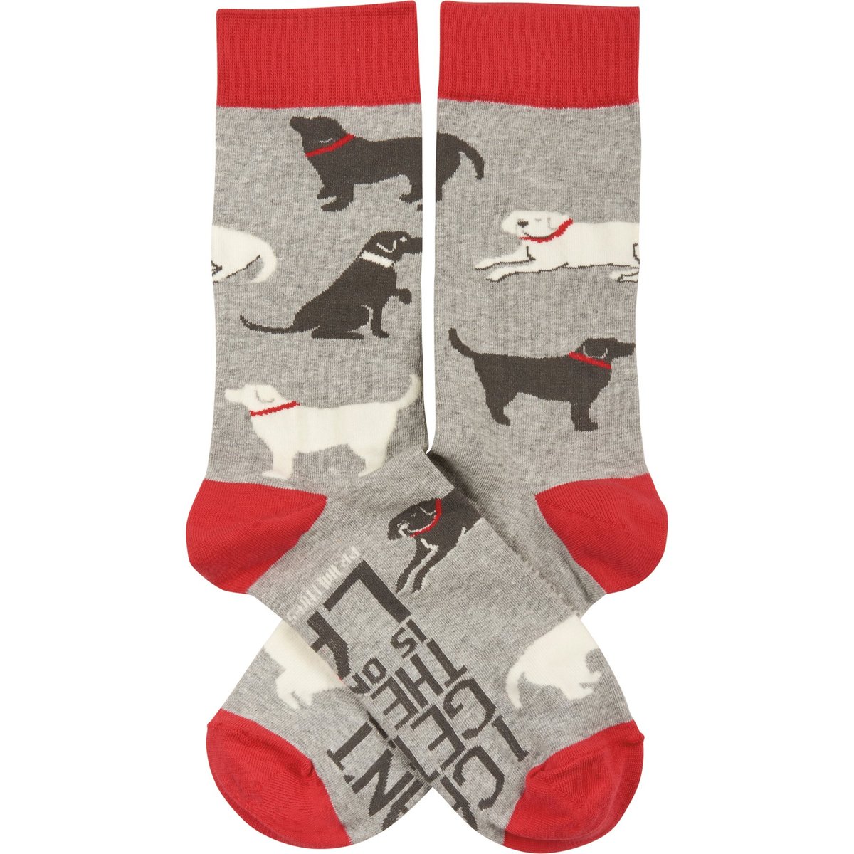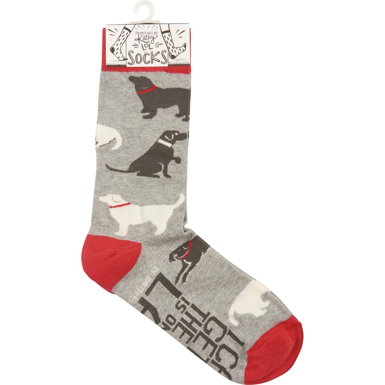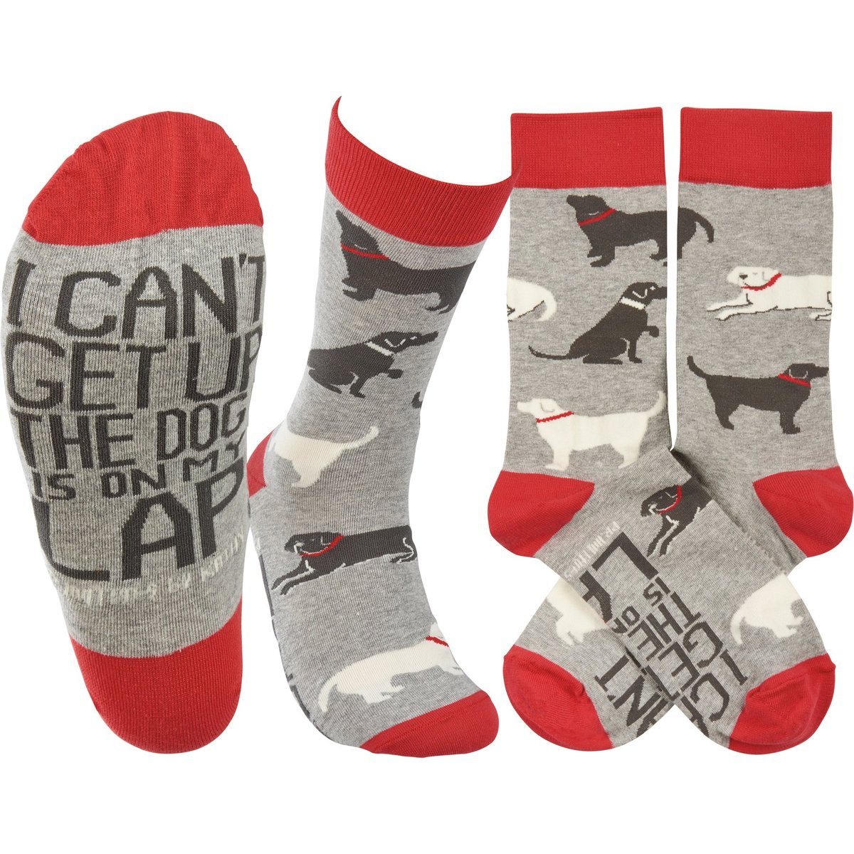 A pair of colorful woven socks from our Pet Collection displaying hand illustrated designs of various dogs with "I Can't Get Up The Dog Is On My Lap" sentiment on the bottom of the socks. Socks feature a one size fits most design made with cotton, nylon, and spandex. Our The Dog Is On My Lap socks come with a header card and a clear plastic hanger for display. A fun everyday accessory perfect for self-expression or gifting on any occasion.