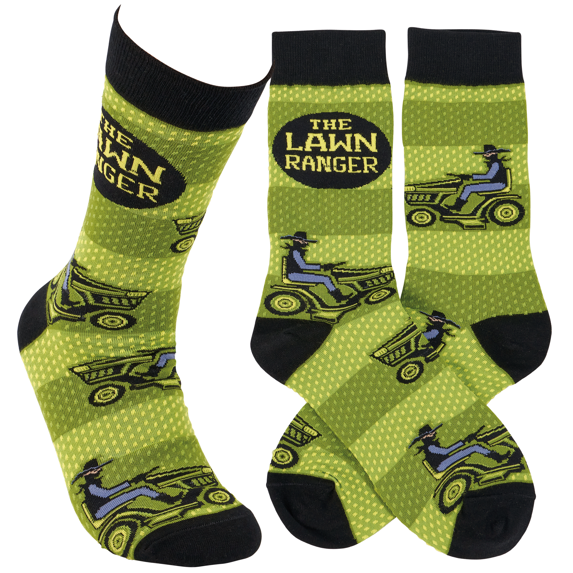A pair of colorful socks from our Father's Day Collection displaying playful hand illustrated designs of people dressed like a Texas ranger riding lawn mowers with a fun dad themed sentiment that reads "The Lawn Ranger." These giftable socks are made with a cotton, nylon, and spandex blend for a one size fits most design. Our The Lawn Ranger socks come with a decorative header card and a clear plastic hanger for easy rack display and gifting. A fun father's day gift perfect for everyday self-expression.
