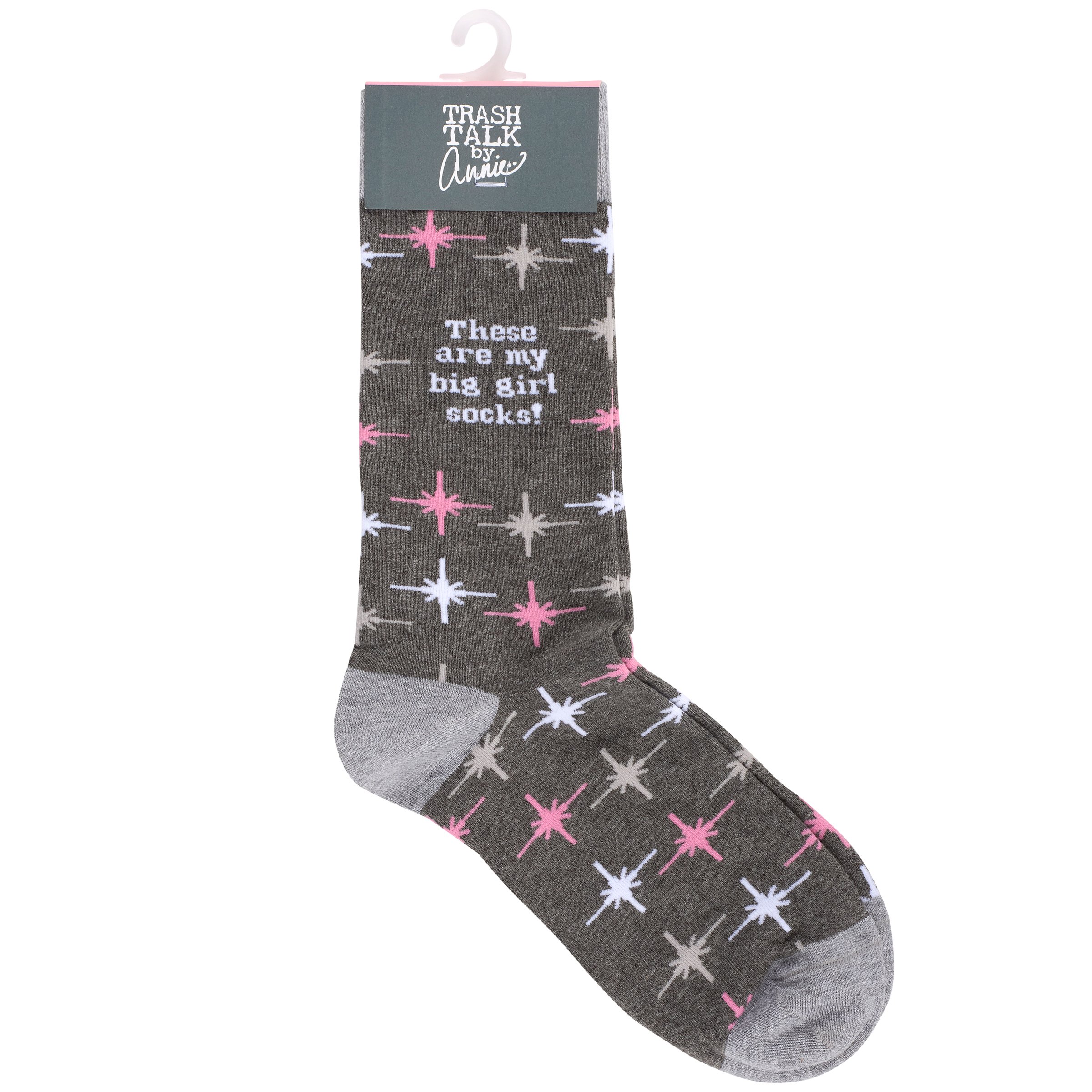 A pair of retro socks from our Trash Talk By Annie Collection flaunting a classy pink and gray pattern with a sassy sentiment that reads "These Are My Big Girl Socks!" These cozy socks are made with cotton, nylon, and spandex to create a one-size-fits-most design. Each pair of socks is packaged on a clear plastic hanger with header card for graceful display in store. Our These Are My Big Girl socks call back to a vintage style with modern sassy sentiments, perfect for making a statement while getting a giggle out of others. Colorful and cozy socks always make a great gift for everyday self-expression.