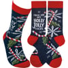 These colorful socks feature woven designs with coordinating "These Are My Holly Jolly Socks" sentiment. Cotton, nylon, spandex. One size fits most.