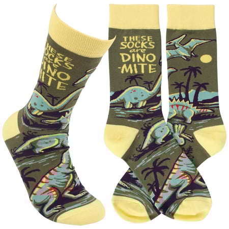 A pair of colorful socks from our LOL-Made You Smile Collection displaying playful hand illustrated designs of various dinosaurs with a funny dinosaur inspired sentiment that reads "These Socks Are Dino-mite." These giftable socks are made with a cotton, nylon, and spandex blend for a one size fits most design. Our These Socks Are Dino-mite socks come with a decorative header card and a clear plastic hanger for easy rack display and gifting. A fun dinosaur themed gift perfect for everyday self-expression.