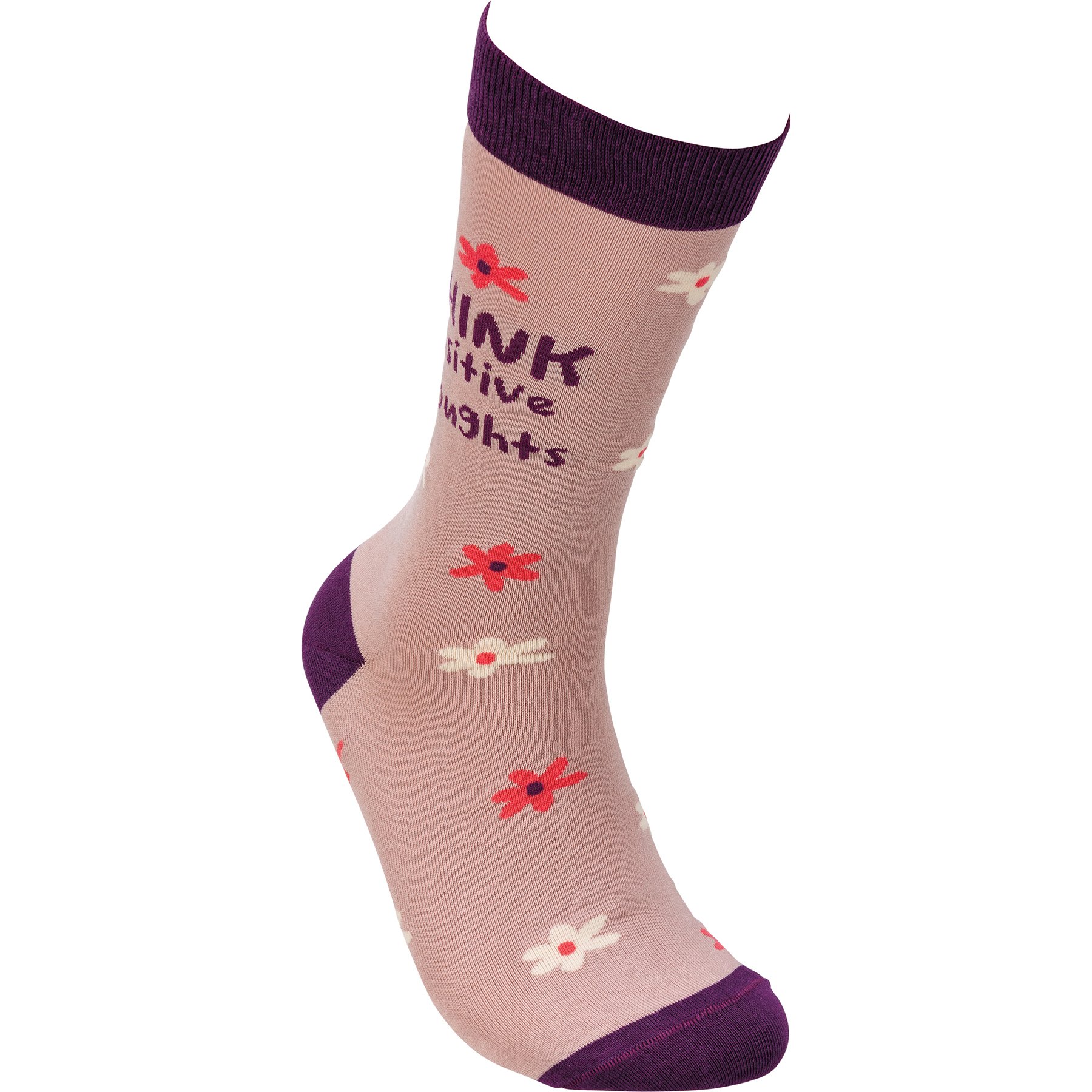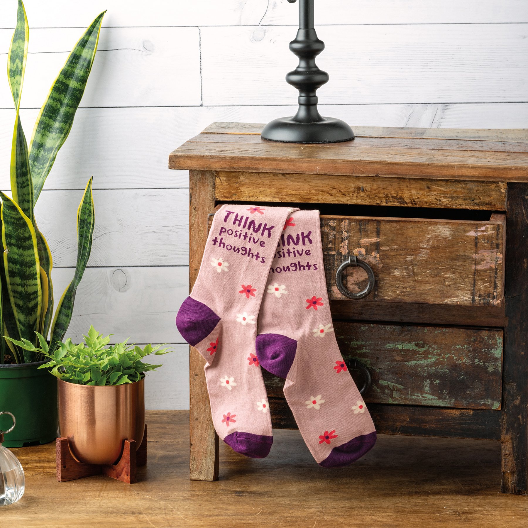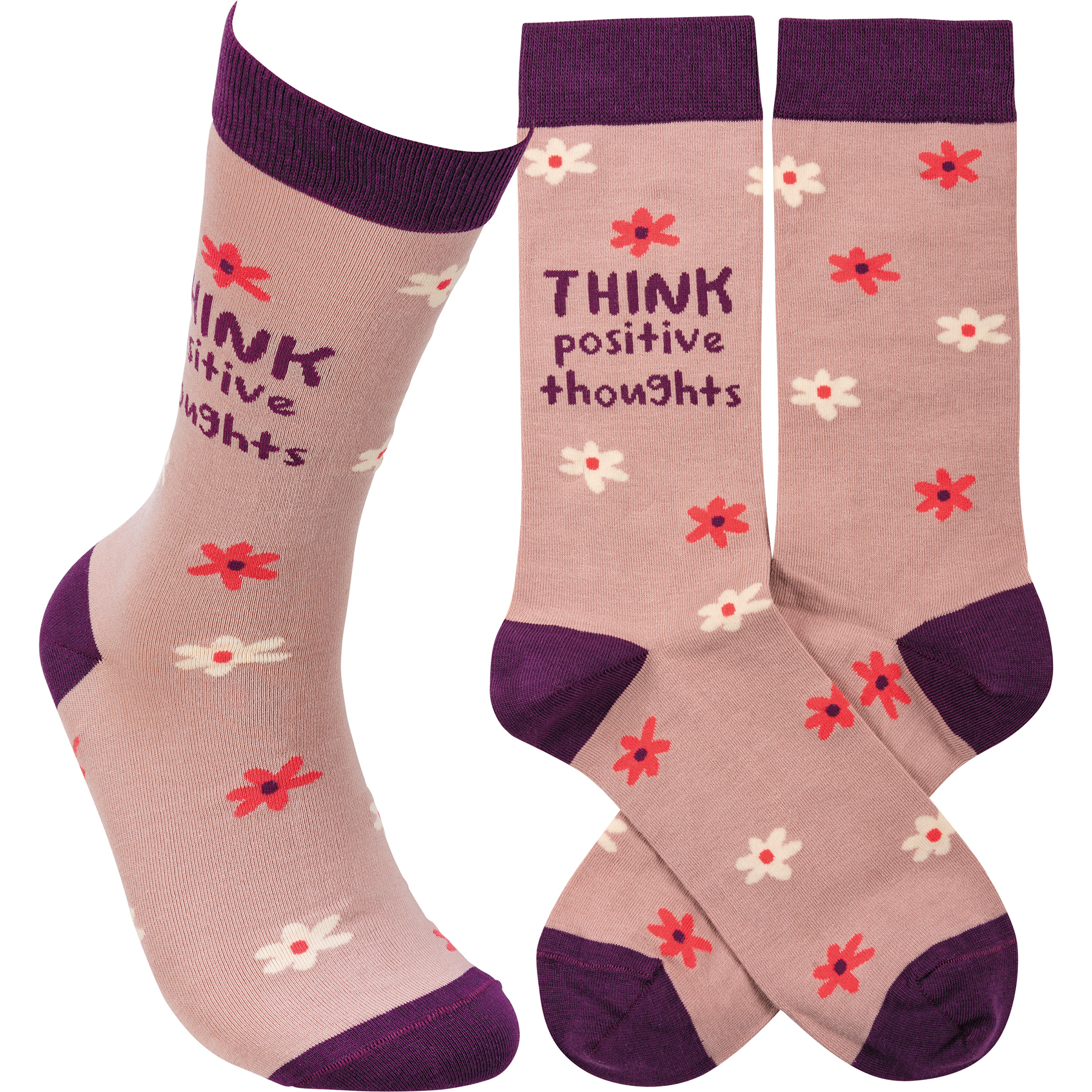 These colorful socks feature woven floral designs with coordinating "Think Positive Thoughts" sentiment. Cotton, nylon, spandex. One size fits most.
