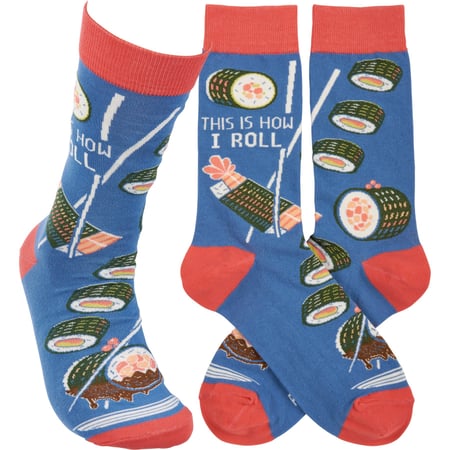 A pair of colorful woven socks from our LOL Made You Smile Collection displaying hand illustrated designs of sushi and chopsticks with "This Is How I Roll" sentiment. Socks feature a one size fits most design made with cotton, nylon, and spandex. Our This Is How I Roll socks come with a header card and a clear plastic hanger for display. A fun everyday accessory perfect for self-expression or gifting on any occasion.