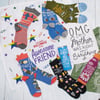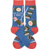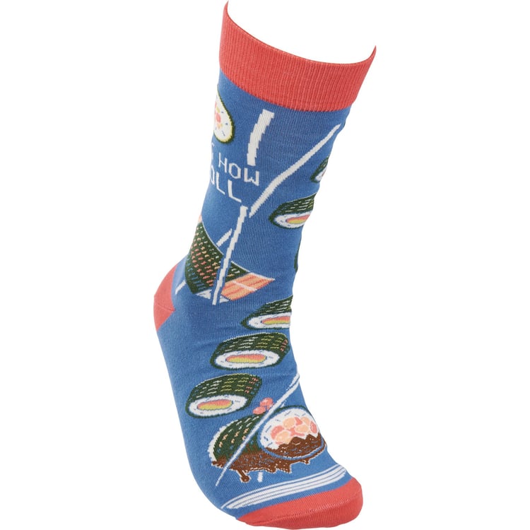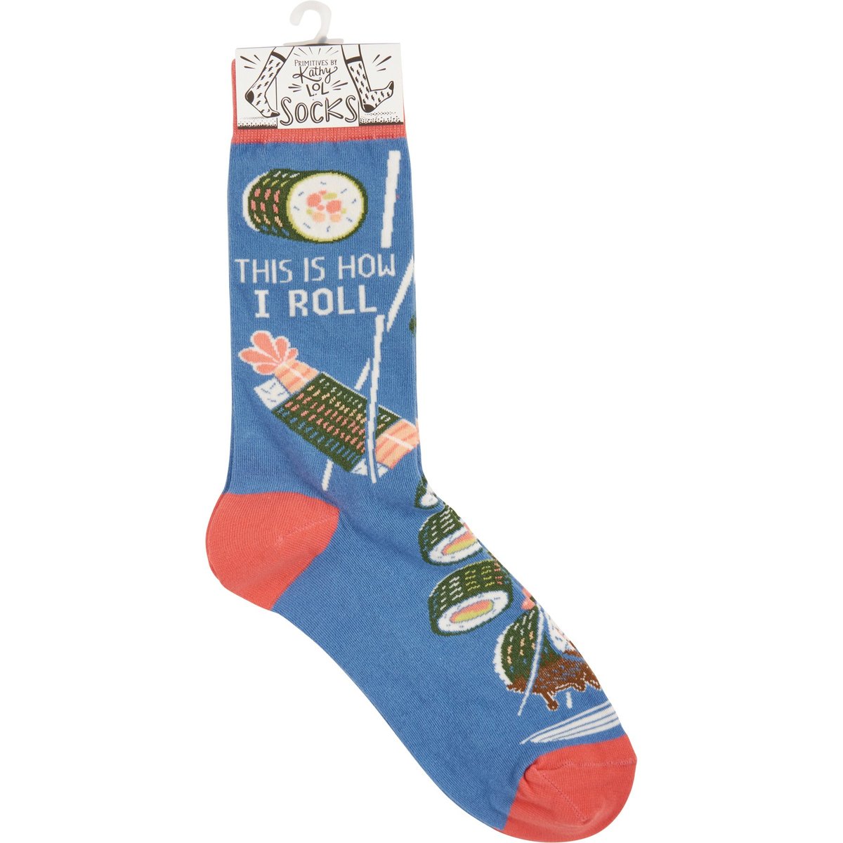A pair of colorful woven socks from our LOL Made You Smile Collection displaying hand illustrated designs of sushi and chopsticks with "This Is How I Roll" sentiment. Socks feature a one size fits most design made with cotton, nylon, and spandex. Our This Is How I Roll socks come with a header card and a clear plastic hanger for display. A fun everyday accessory perfect for self-expression or gifting on any occasion.