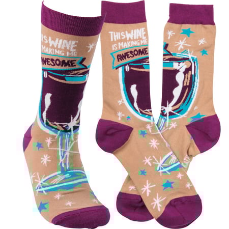 These colorful socks feature woven designs with coordinating "This Wine Is Making Me Awesome" sentiment. Cotton, nylon, spandex. One size fits most.