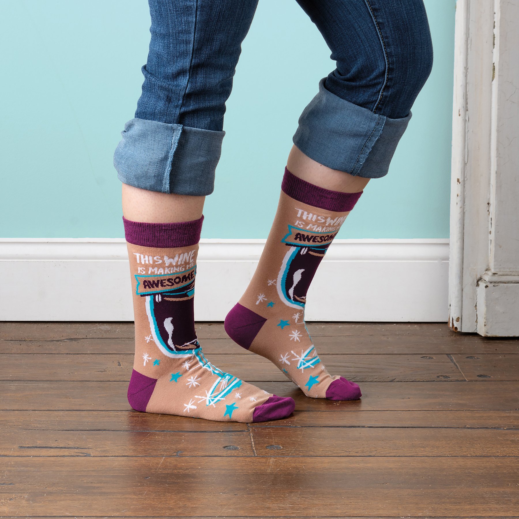 These colorful socks feature woven designs with coordinating "This Wine Is Making Me Awesome" sentiment. Cotton, nylon, spandex. One size fits most.
