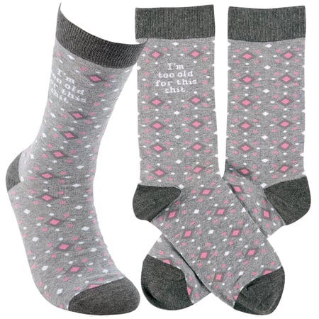 A pair of retro socks from our Trash Talk By Annie Collection flaunting a classy pink and gray pattern with a humorous age-themed sentiment that reads "I'm Too Old For This Shit." These cozy socks are made with cotton, nylon, and spandex to create a one-size-fits-most design. Each pair of socks are packaged on a clear plastic hanger with header card for graceful display in store. Our Too Old For This socks call back to a vintage style with modern sassy sentiments, perfect for making a statement while getting a giggle out of others. Colorful and cozy socks always make a great gift for everyday self-expression.