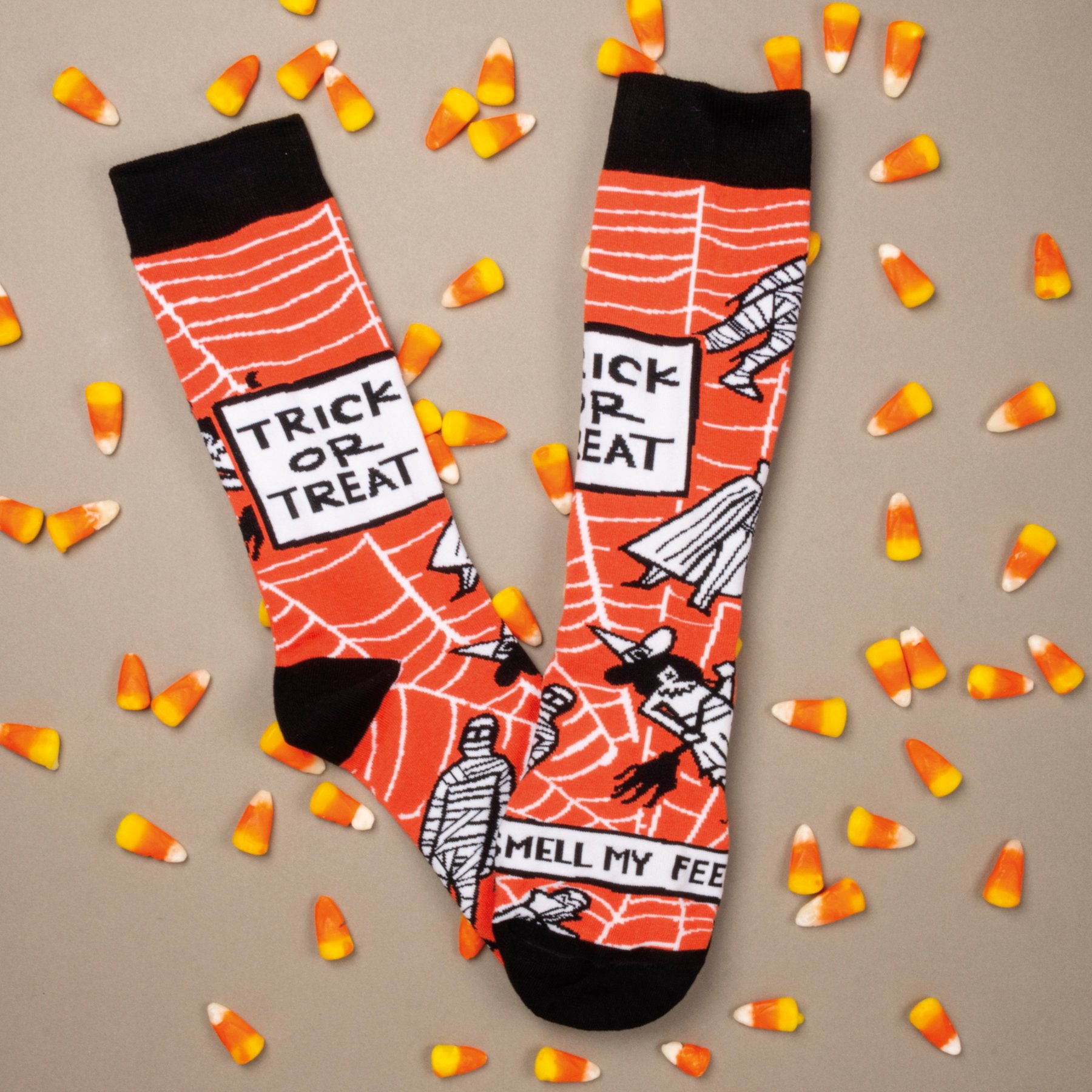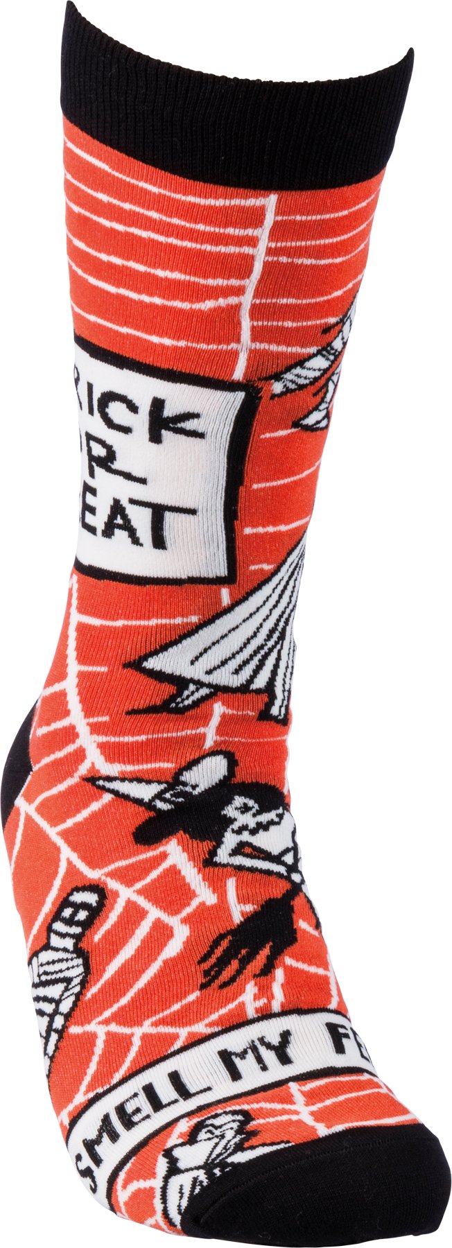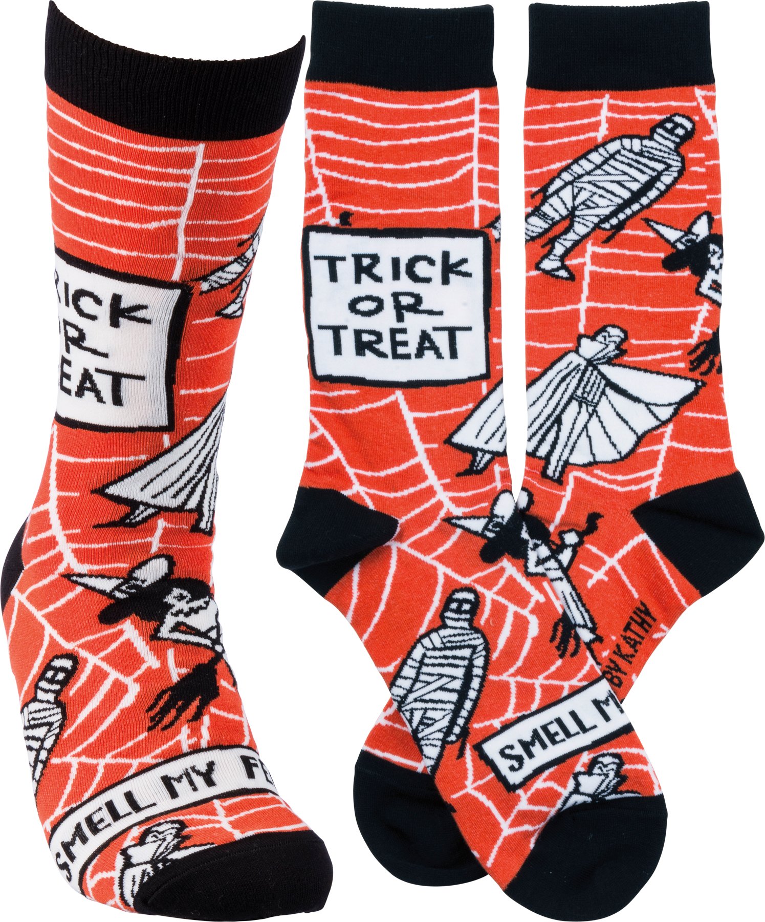 These colorful socks feature woven designs with coordinating "Trick Or Treat Smell My Feet" sentiment. Cotton, nylon, spandex. One size fits most.