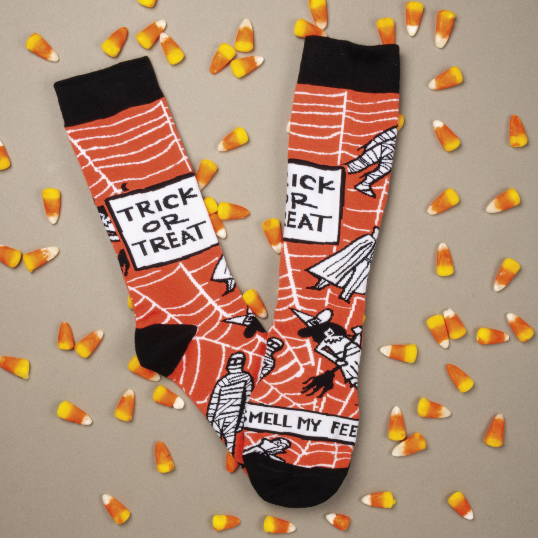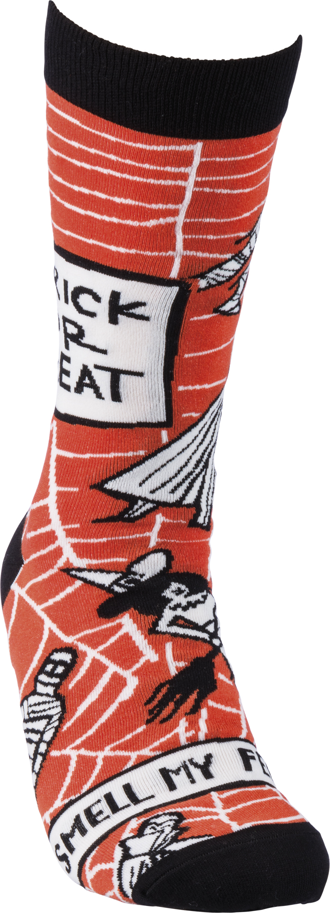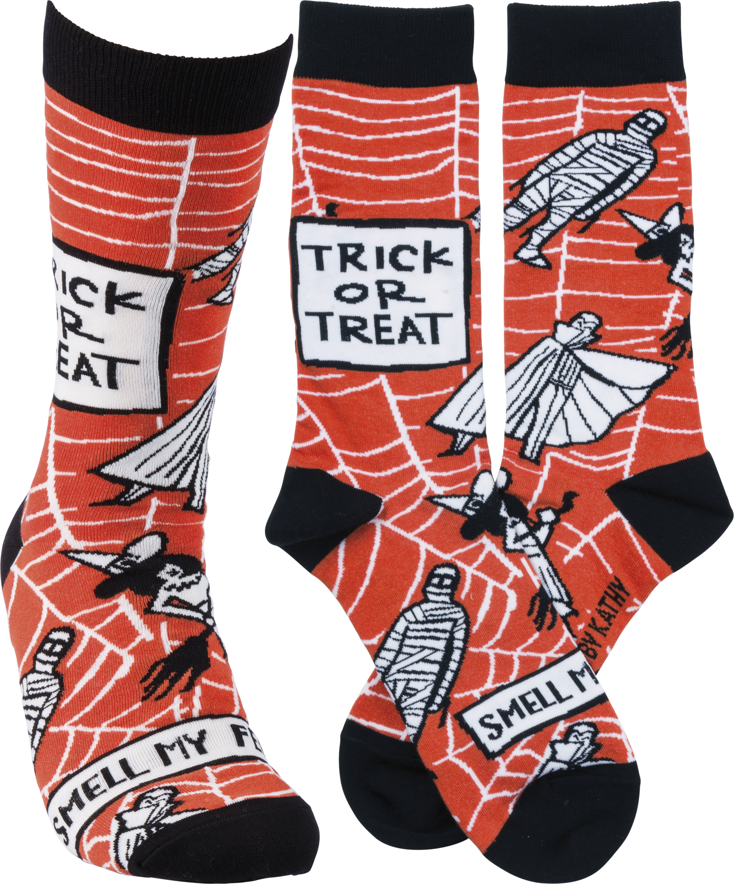 These colorful socks feature woven designs with coordinating "Trick Or Treat Smell My Feet" sentiment. Cotton, nylon, spandex. One size fits most.