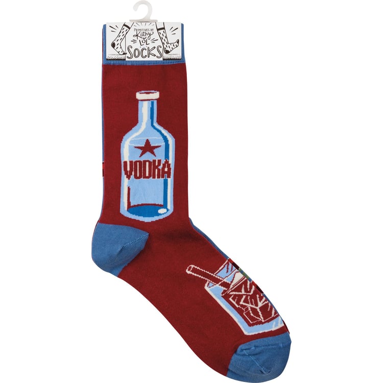 These mismatched socks from our LOL Made You Smile Collection feature woven Vodka & Cranberries designs, one on each sock. Cotton, nylon, spandex. These vodka and cranberries socks are one size fits most.