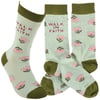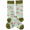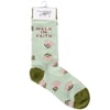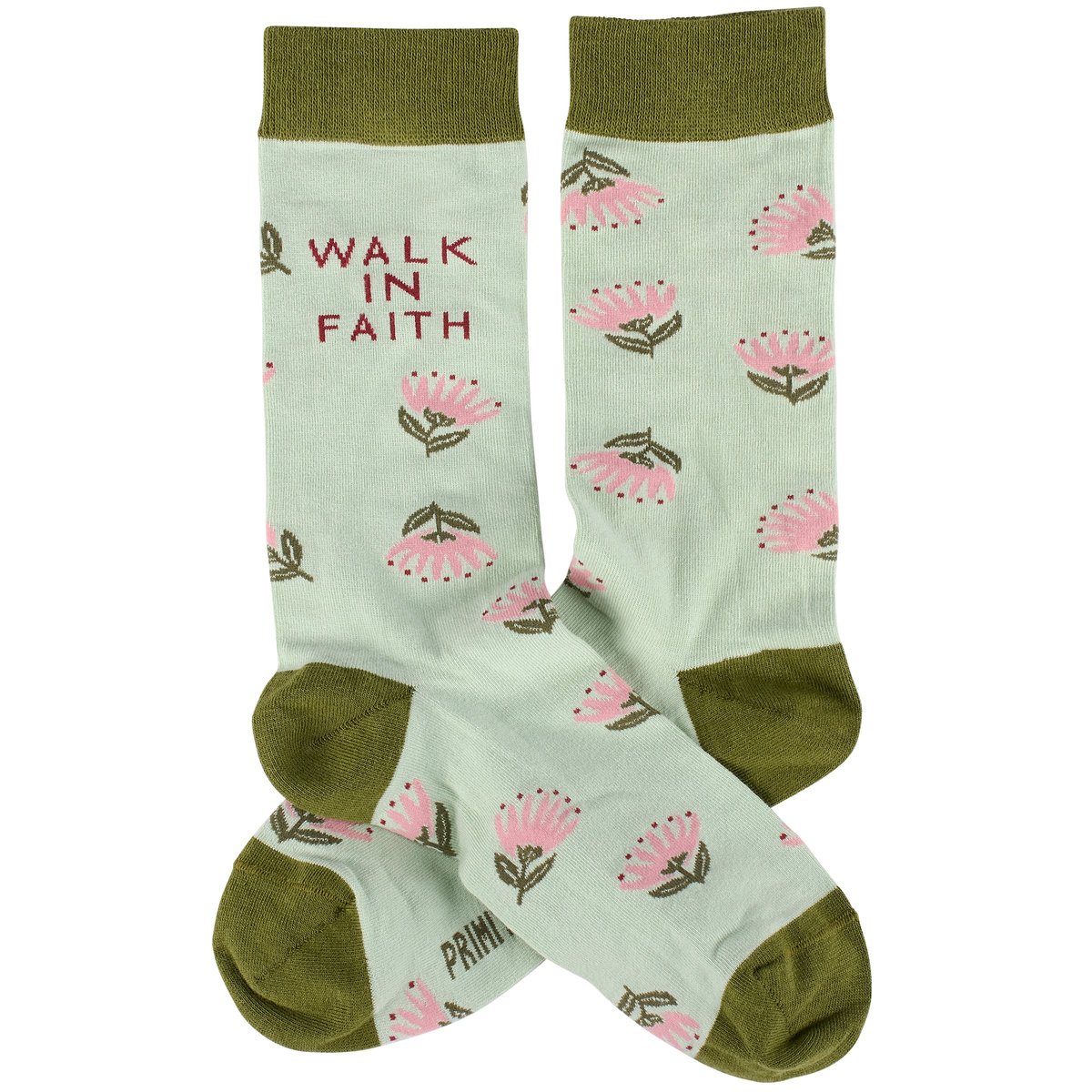 A pair of colorful socks from our Faith Collection displaying a beautiful pattern of pink flowers with a faith inspired sentiment that reads "Walk In Faith." Flower designs are replicated from original hand illustrated art. These giftable socks are made with a cotton, nylon, and spandex blend for a one size fits most design. Our Walk In Faith socks come with a decorative header card and a clear plastic hanger for easy rack display and gifting. A faith-themed gift perfect for everyday self-expression.